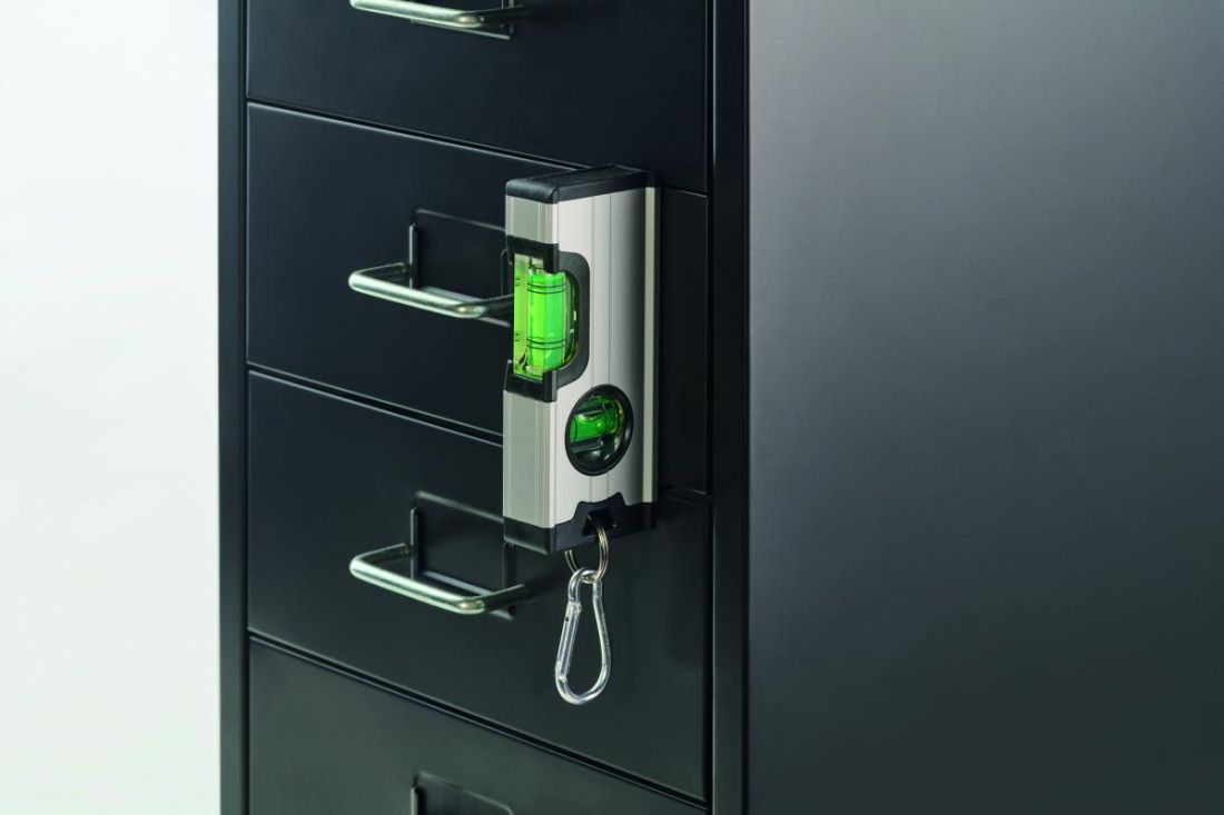 Mini nivel doble magnético en carcasa de aluminio con mosquetón. El mosquetón no es para escalada (uso no profesional).