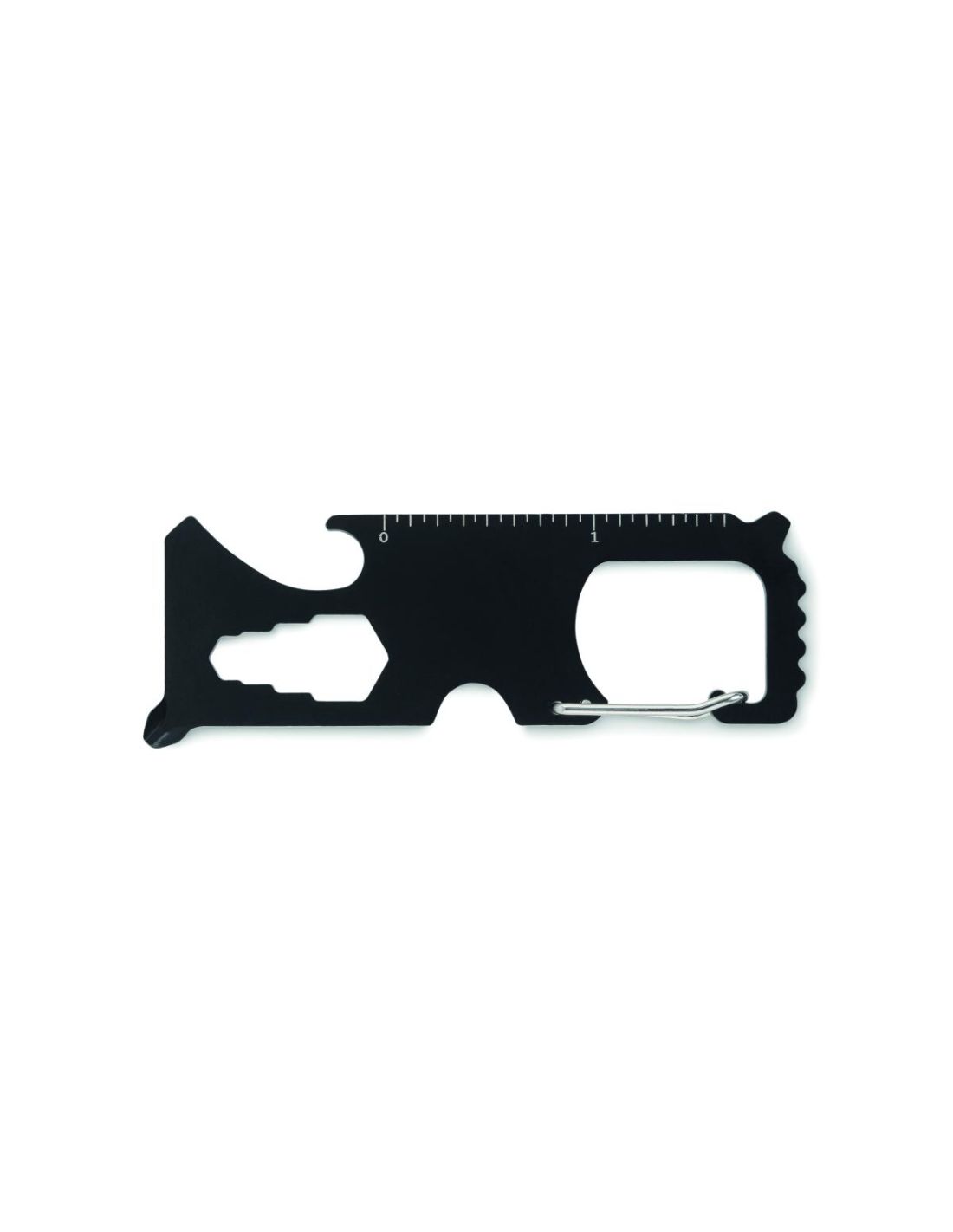Multiherramienta de bolsillo de acero inoxidable. 8 funciones. Incluye: sierra de dientes, cortaalambres, llave inglesa, destornillador Phillips, destornillador plano, escala medidora, abrebotellas y llavero.