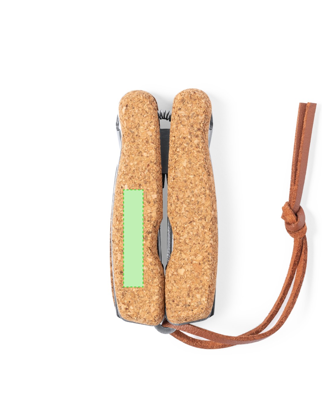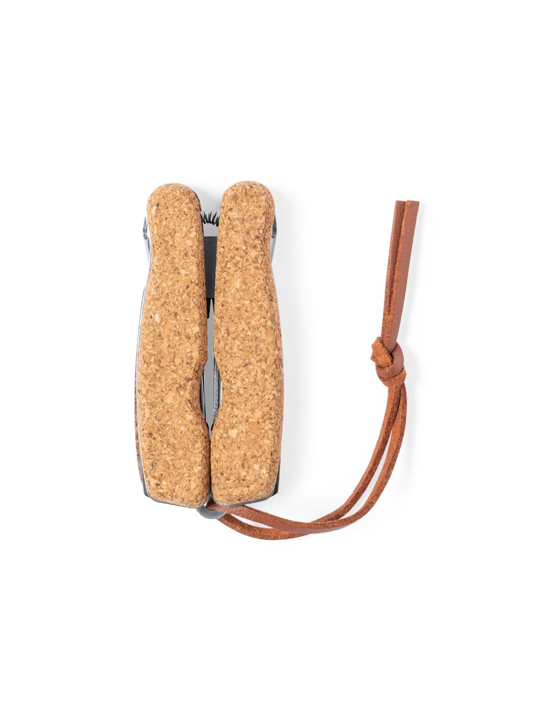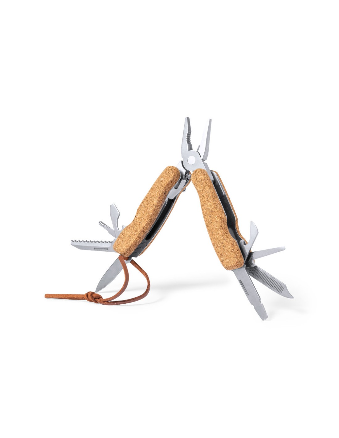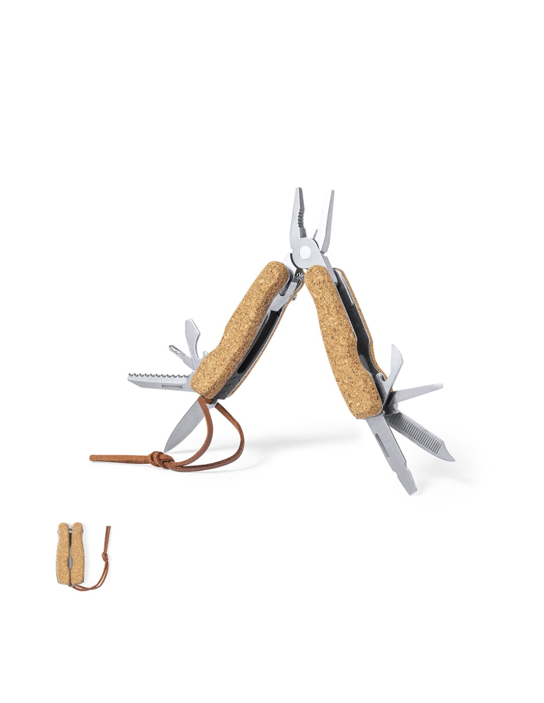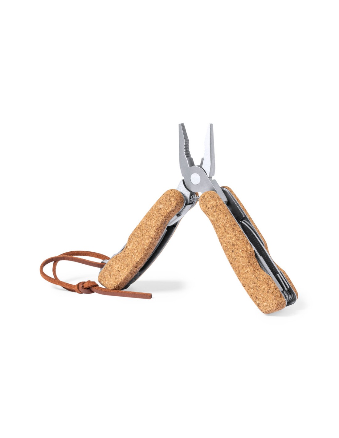 Multiherramienta de línea nature, con resistente cuerpo en acero inox y empuñadura de corcho natural. Con 12 funciones, entre otras cuchillo y navaja destornillador con puntas planas y philips lima abridor y alicates. Cordón a juego en polipiel y presentada en caja individual de diseño kraft.