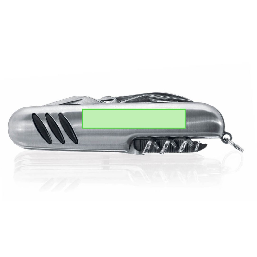 Navaja multiusos de acero inox de 10 funciones con empuñadura antideslizante. Incluye navaja, abridores, destornillador, lima, tijeras y anilla para llavero. Presentada en caja individual.