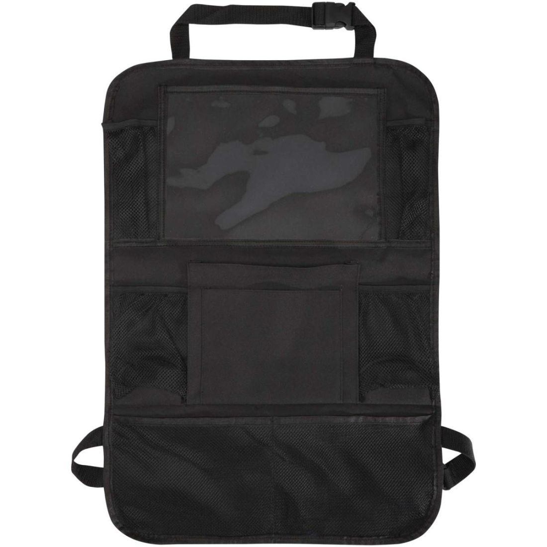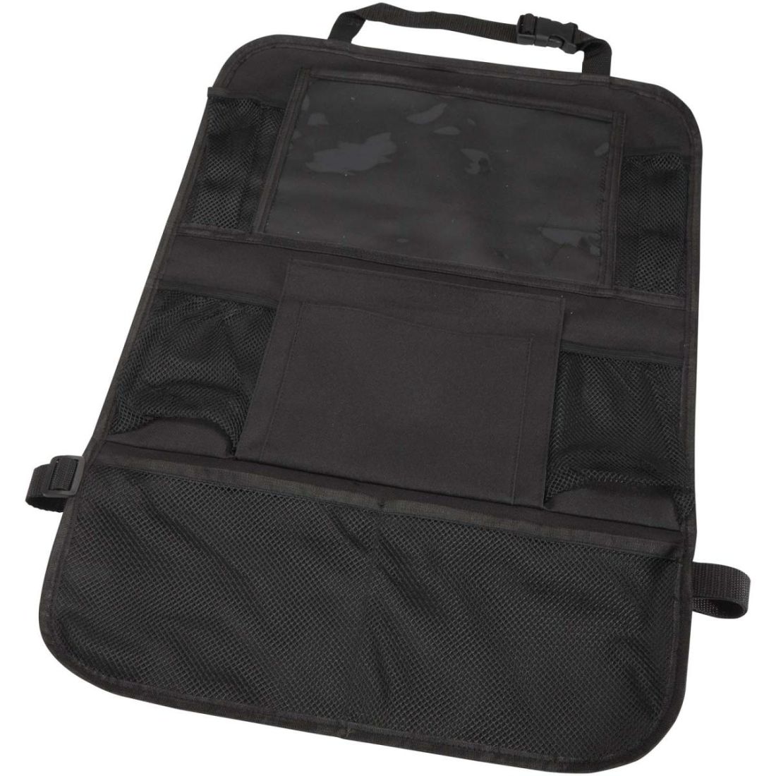 Organizador para el asiento trasero del coche con múltiples bolsillos de malla para guardar objetos esenciales como tentempiés, juguetes o cantimploras, además de una ventana de PVC para una tableta. Se fija con facilidad al asiento delantero y ayuda a mantener el coche ordenado. Es ideal para familias, viajes por carretera o uso diario.