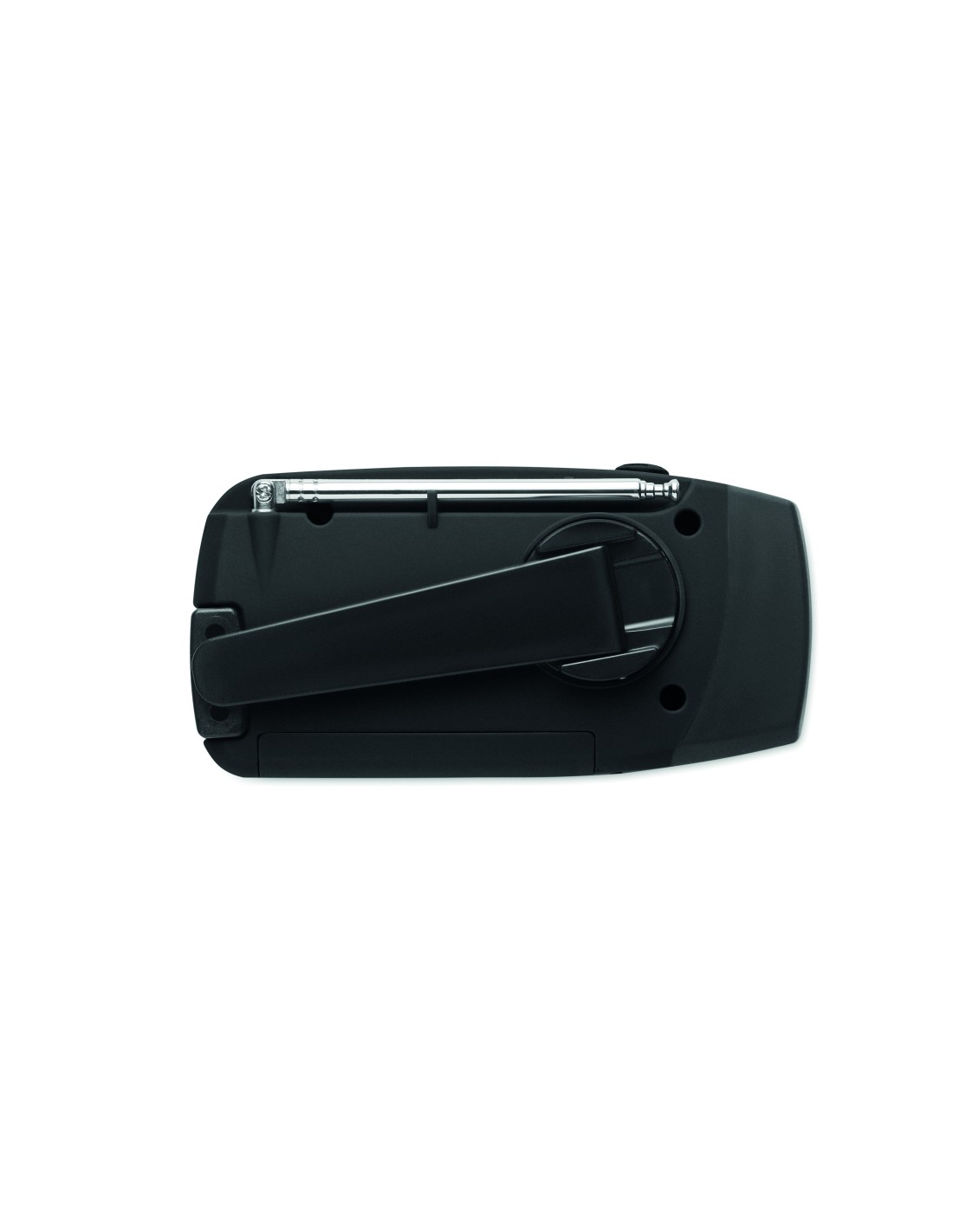 Radio AM/FM portátil en ABS con linterna LED (2 ajustes) y un power bank de 1200 mAh para carga de emergencia. Autoalimentado por energía solar y dinamo.