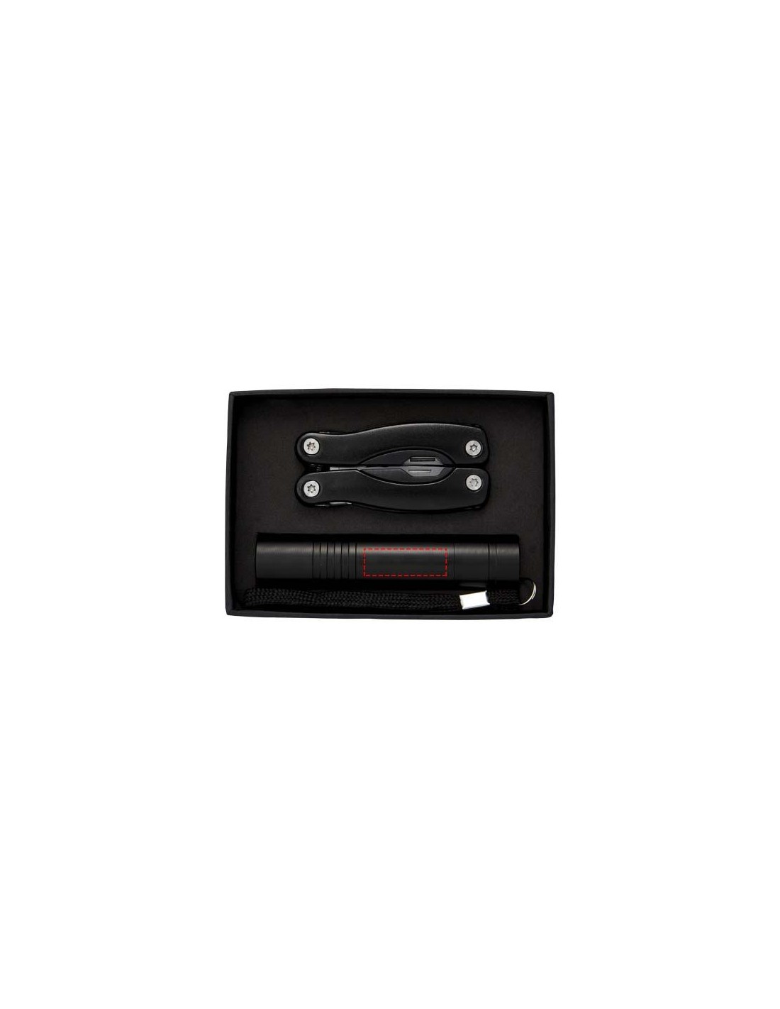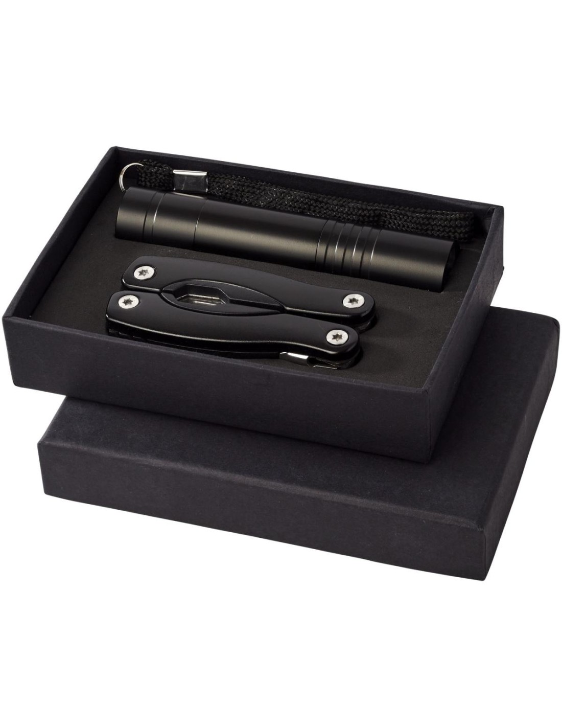 Multiherramienta de 11 usos y linterna con luz LED. Pilas incluidas. Presentado en una caja de regalo de cartón negra con flocado interior de EVA.