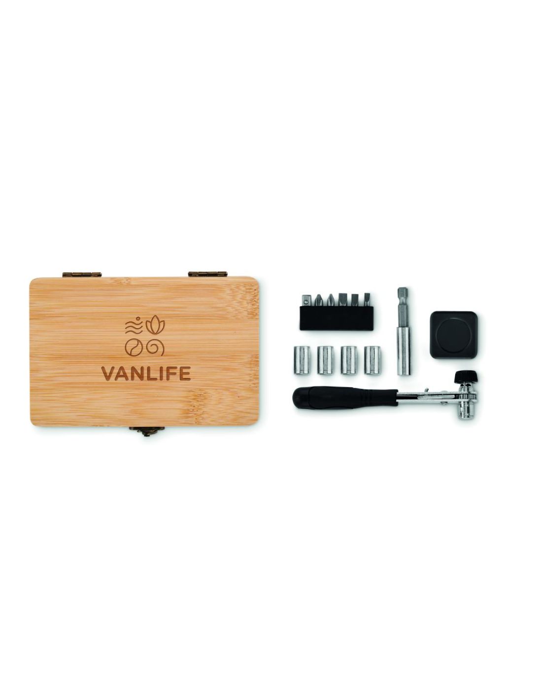Set herramientas 13 piezas presentado en estuche de bambú. Contiene cabezales 3 planos (4, 5, 6mm), 2 Philips (PH1, PH2) y 1 adaptador, 4 vasos (7mm, 8mm, 9mm, 10mm), y 1 cinta métrica. El bambú es material natural, el color del articulo puede variar. FSC®-certified | FSC 100%, N5.7, FSC-C213206