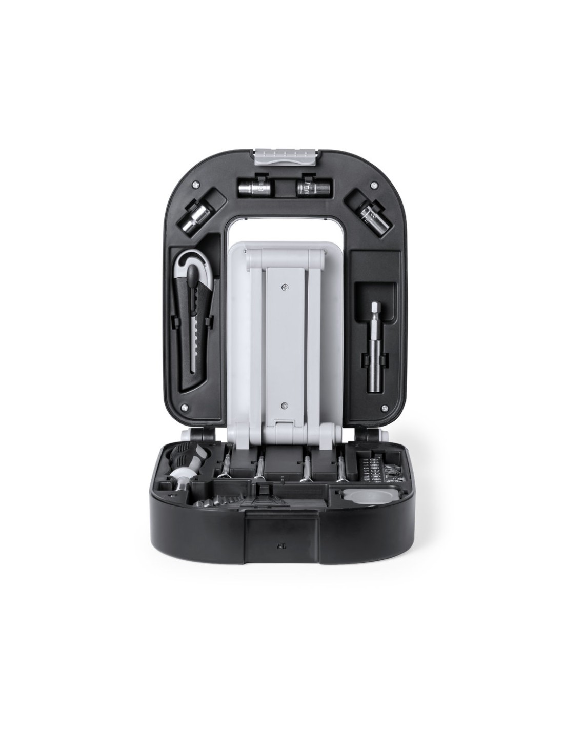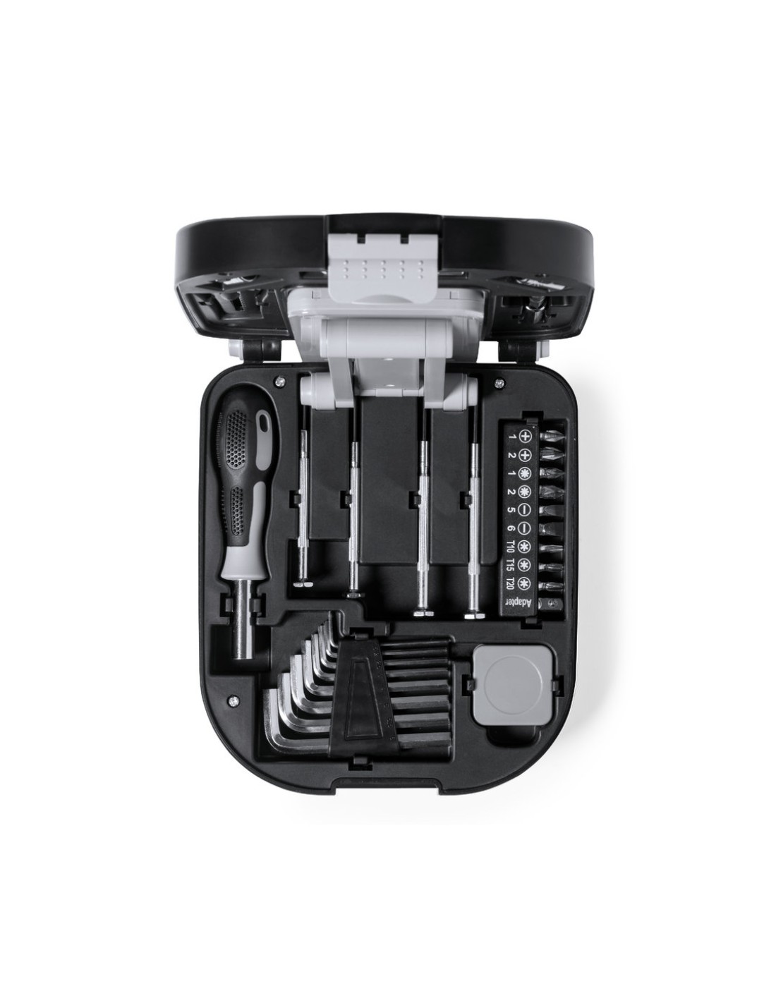 Original set de herramientas con luz y 30 accesorios. Presentado en resistente caja de ABS negra con cierre. Lámpara plegable integrada la caja, con 24 LEDs y botón ON/OFF. Incluye destornillador con multitud de puntas planas, philips, torx… Con kit de destornilladores de precisión llaves de tubo y llaves allen en distintas medidas cutter y flexómetro 1m. Lampará con alimentación a pilas (3xAA no incluidas). Presentado en caja individual de diseño kraft.