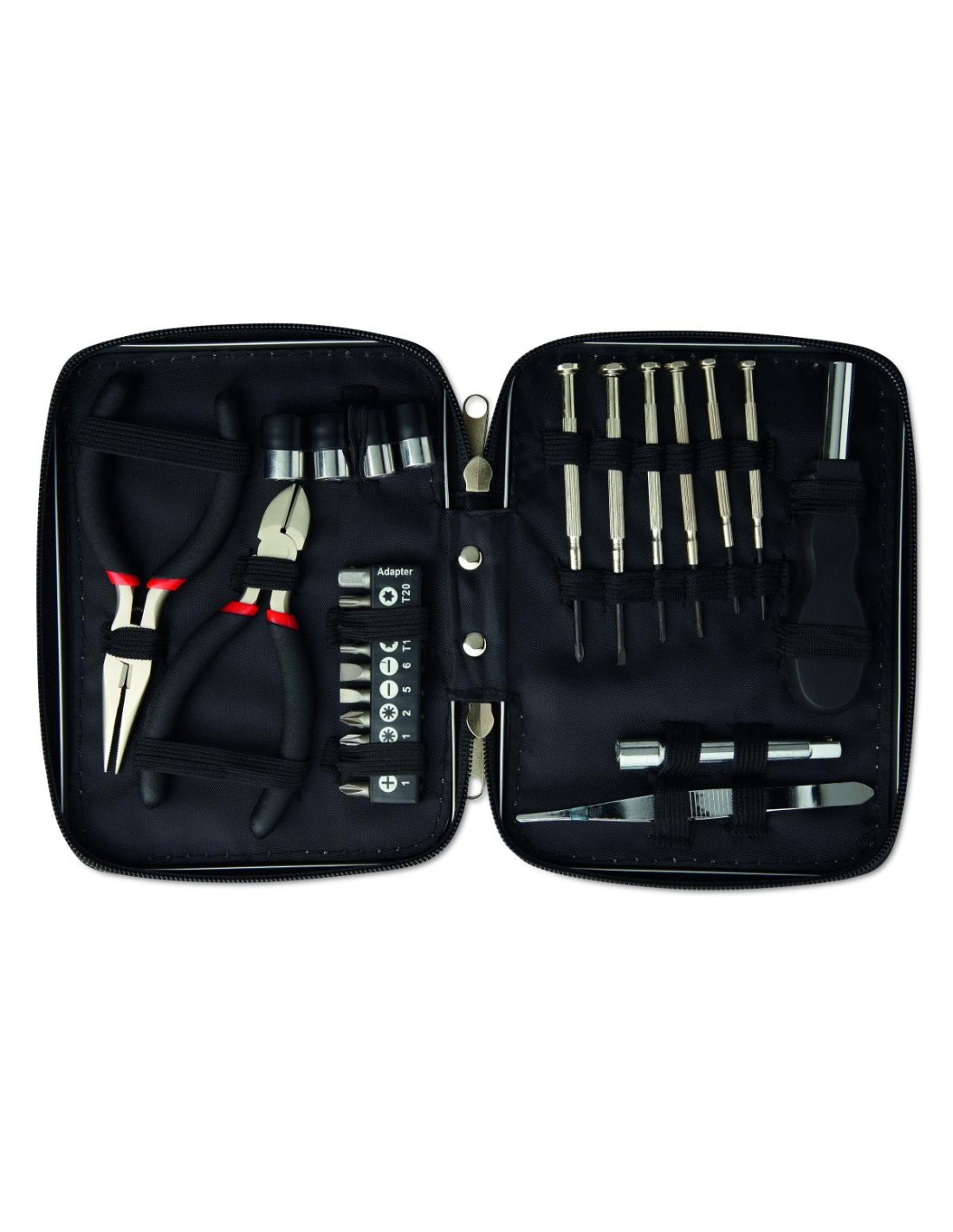 Set de herramientas de aluminio que contiene alicates de punta, alicates de corte, 1 destornillador, 1 adaptador, 10 cabezas intercambiables, 1 tijeras y 6 destornilladores de precisión.