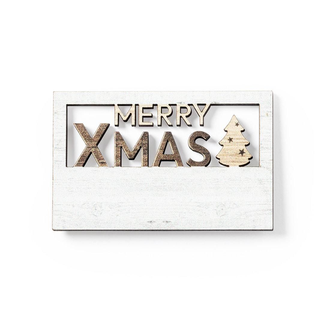 Original imán Merry Christmas fabricado en madera natural, con texto troquelado y de original acabado bicolor. Amplia superficie de marcaje y distintivo Made In Europe.