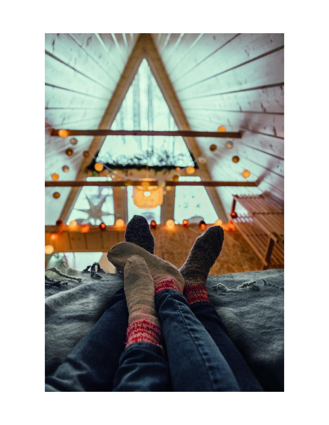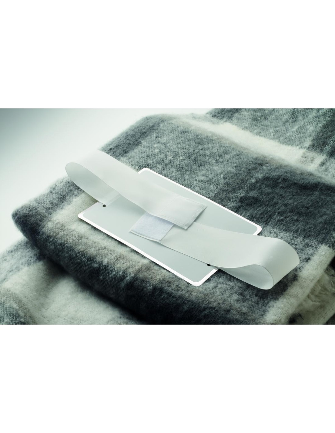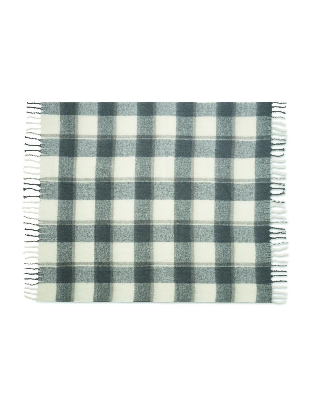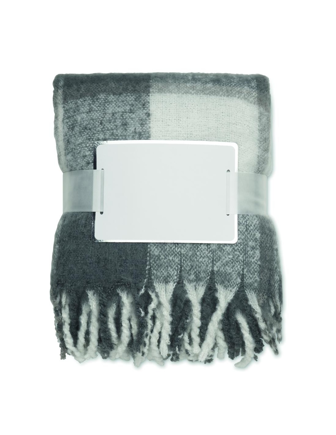 Manta de poliéster RPET mohair con diseño a cuadros y flecos enrollados a mano. Envuelta en cinta y tarjeta imprimible.