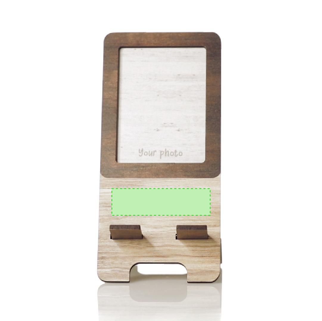 Soporte para smartphone con portafotos integrado. Fabricado en madera natural, con original acabado bicolor. Amplia superficie de marcaje, de fácil montaje y con distintivo Made In Europe.