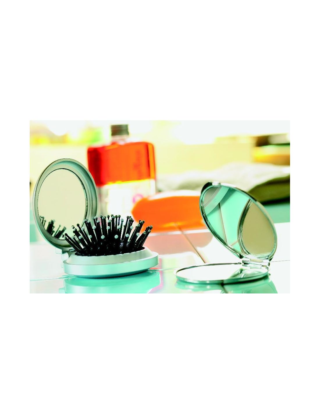 Cepillo/espejo plegable de plástico con acabado plateado.