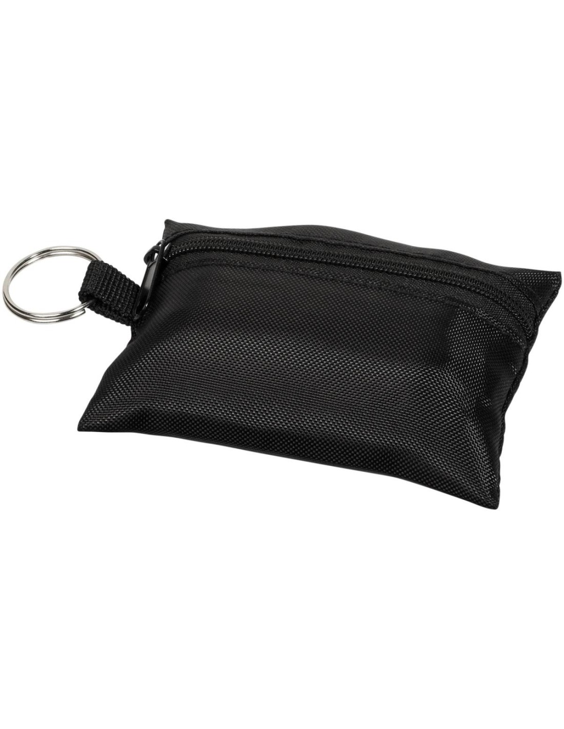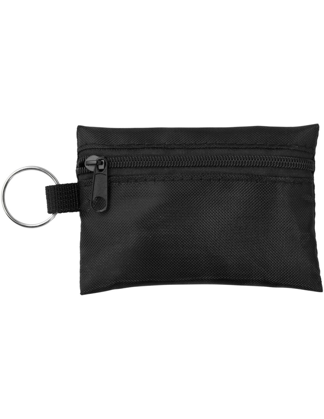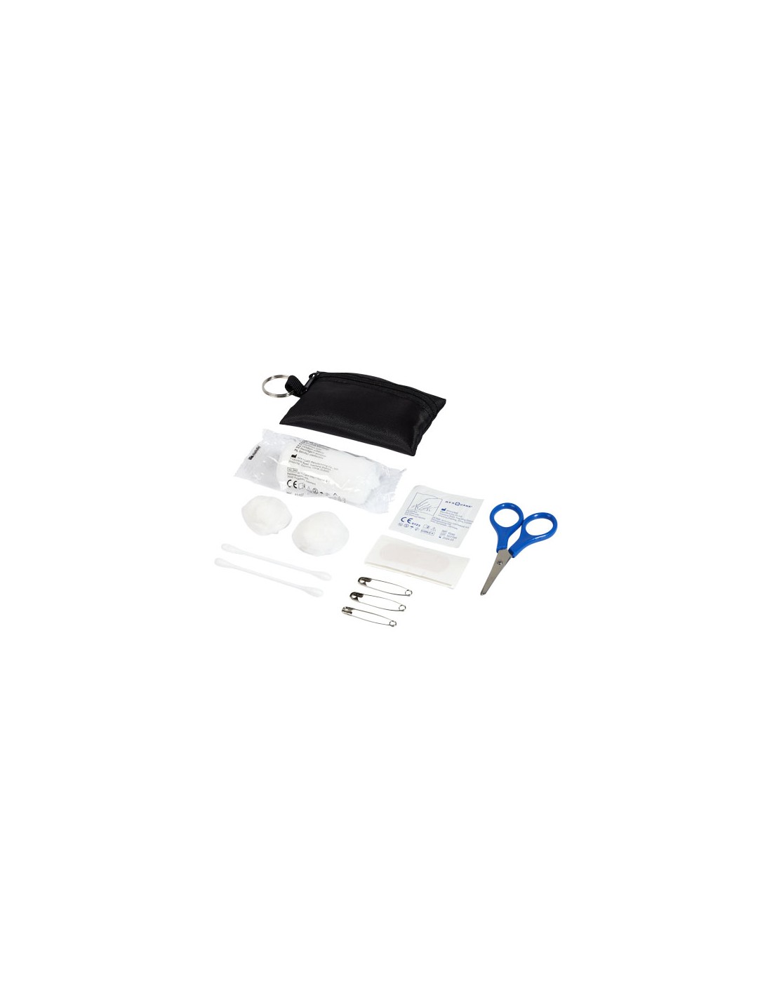 Práctica funda de poliéster con llavero que contiene 16 elementos de primeros auxilios. El kit contiene un par de tijeras (9 cm), 2 toallitas limpiadoras , 1 venda elástica (4 metros x 6 cm), 2 bolas de algodón (0,5 g), 3 imperdibles (3,6 cm), 5 tiritas (45x19 mm) y 2 bastoncillos (8 cm). Ideal para viajes, festivales, eventos y otras actividades al aire libre. Además, cuenta con una amplia zona de decoración. Un botiquín de primeros auxilios se considera un producto sanitario y se rige por la Directiva 93/42/CEE, en función del uso previsto: «Diagnóstico, prevención, control, tratamiento o alivio de enfermedades». Este dispositivo médico es de Clase I.