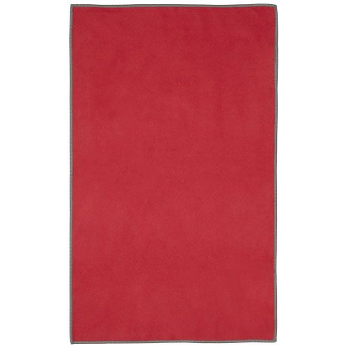 La toalla deportiva absorbe muy bien, es ligera, se seca rápido y su tejido es duradero y extremadamente suave. Cuando la toalla está doblada y sujeta con la banda elástica, se reduce a un tamaño pequeño, por lo que es ideal para llevarla al gimnasio y a la piscina o para ir de mochilero o de acampada. La toalla tiene un tamaño de 50 × 30 cm y está fabricada con un 90 % de poliéster reciclado con certificación GRS y un 10 % de nylon, y puede lavarse en la lavadora a 40 °C. Se entrega con una bolsa de almacenamiento (15,5 × 10 cm) fabricada con plástico PET reciclado, con una gran superficie para imprimir un logotipo.