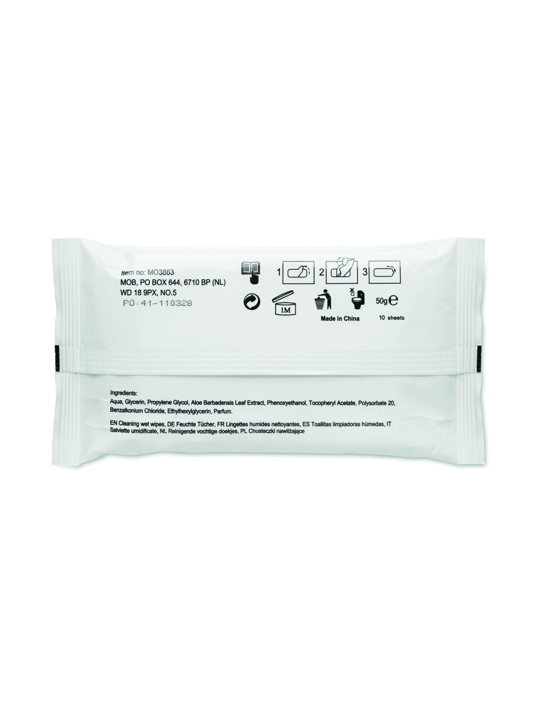 10 toallitas húmedas en bolsa. Tamaño de la toallita desplegada: 15x20cm. Este producto está clasificado como artículo cosmético.
