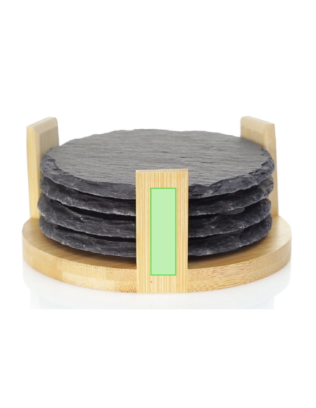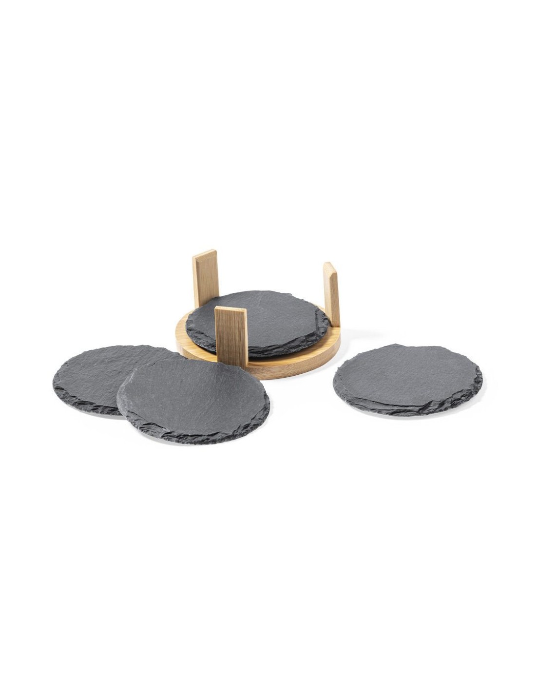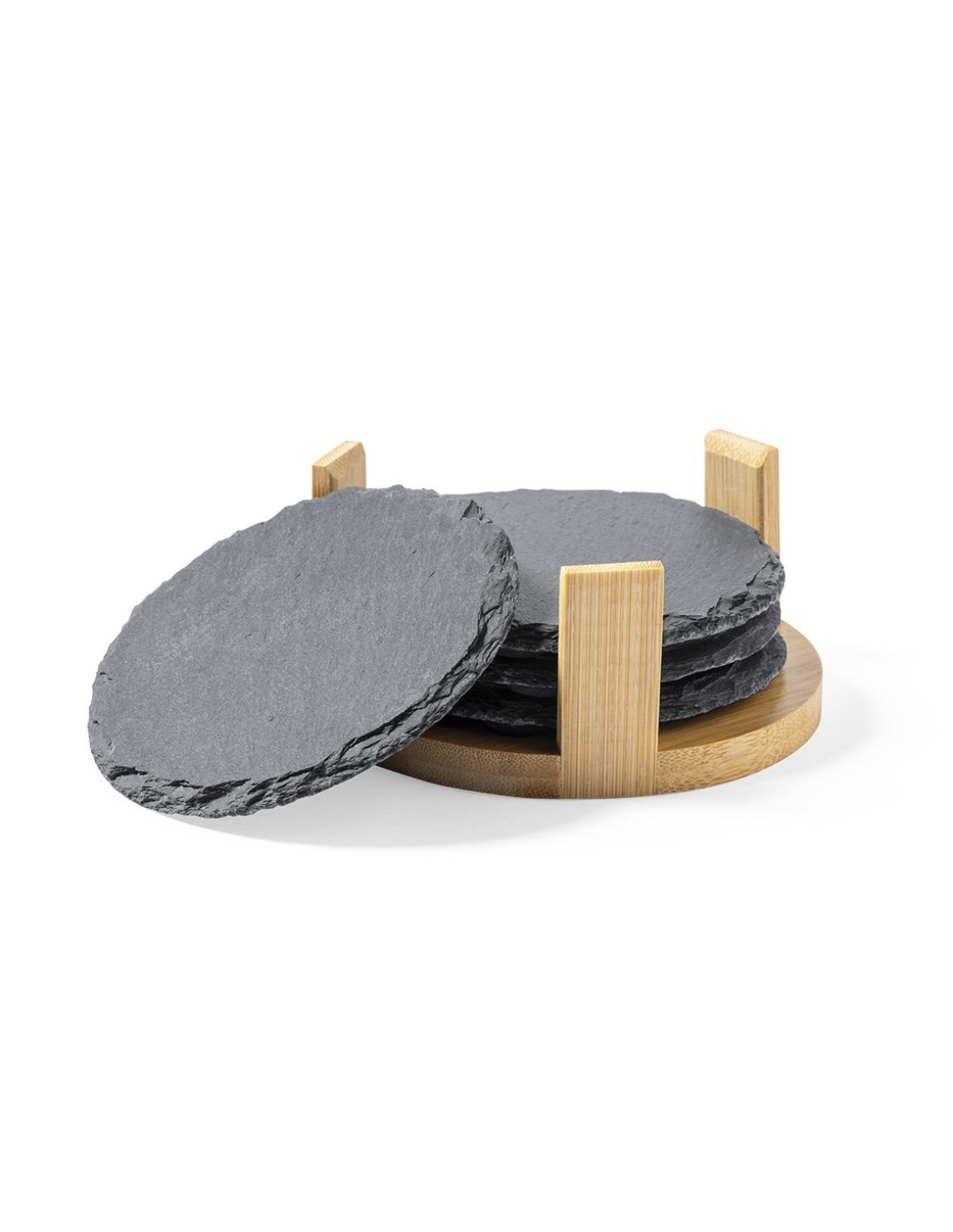 Set de 4posavasos fabricados en pizarra natural, con soporte de bambú. Presentada en atractiva caja individual de diseño acabado kraft.