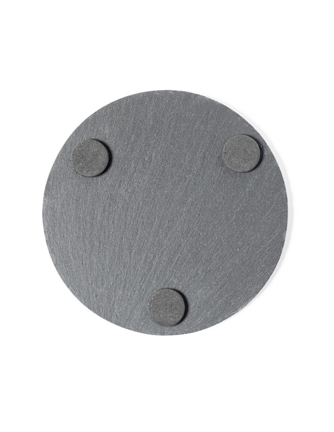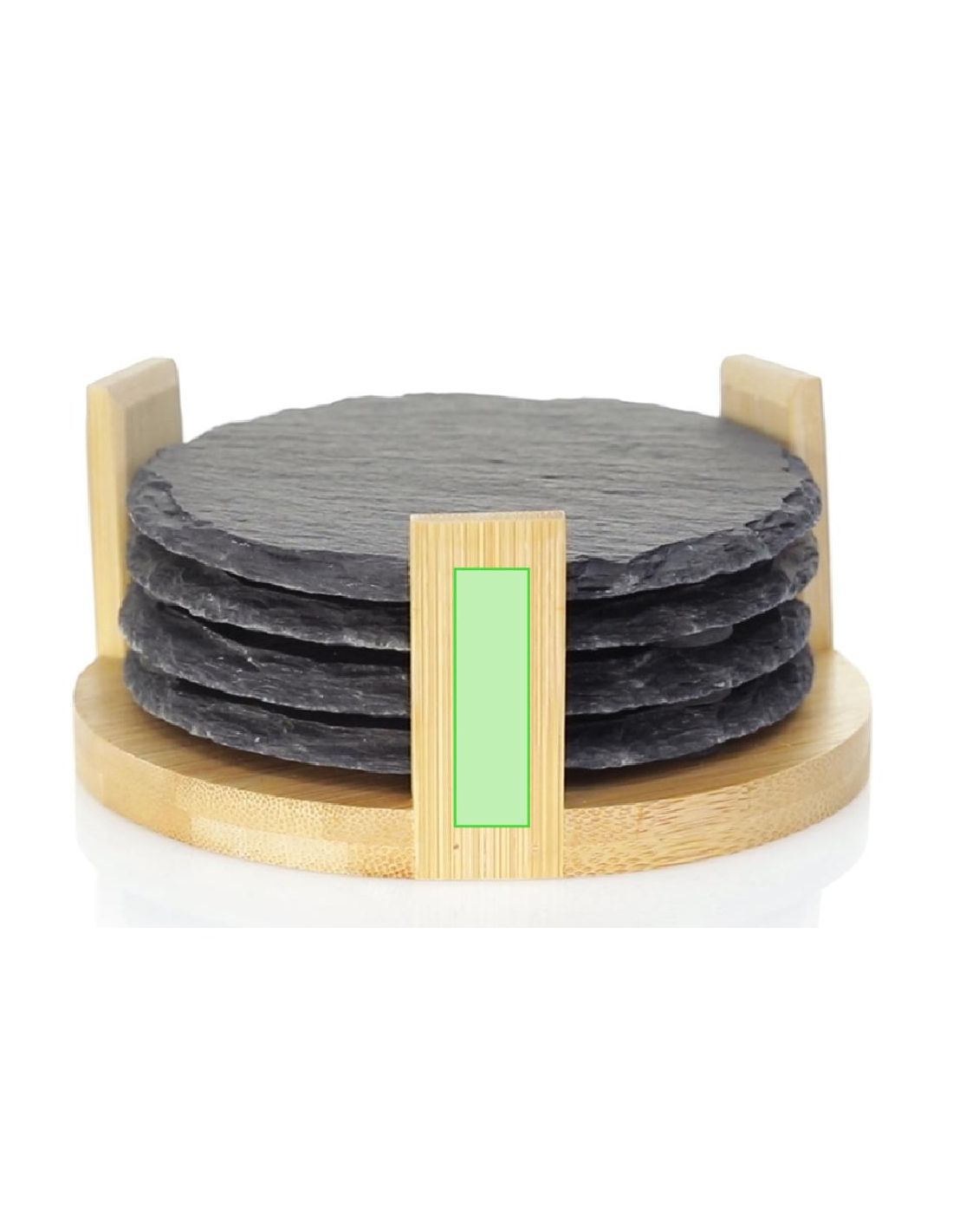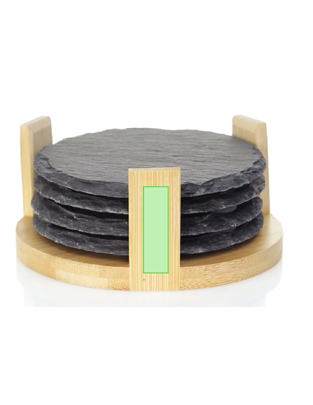 Set de 4posavasos fabricados en pizarra natural, con soporte de bambú. Presentada en atractiva caja individual de diseño acabado kraft.