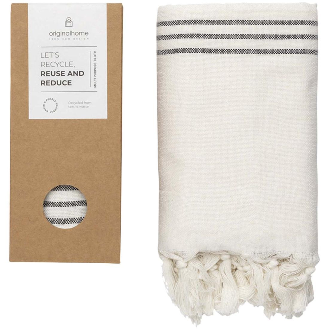 Esta tela versátil es lo bastante gruesa para usarla como plaid o toalla, lo bastante fina para llevarla como fular y lo bastante compacta para transportarla a cualquier parte. Fabricada con materiales 100 % reciclados de la industria textil de Bangladesh, está tejida en un telar manual tradicional y apoya el emprendimiento femenino. Un regalo social ideal que contribuye a una causa sostenible y socialmente responsable. Tamaño: 85 × 175 cm. Composición: 70 % algodón reciclado, 25 % poliéster reciclado, 5 % otras fibras recicladas.