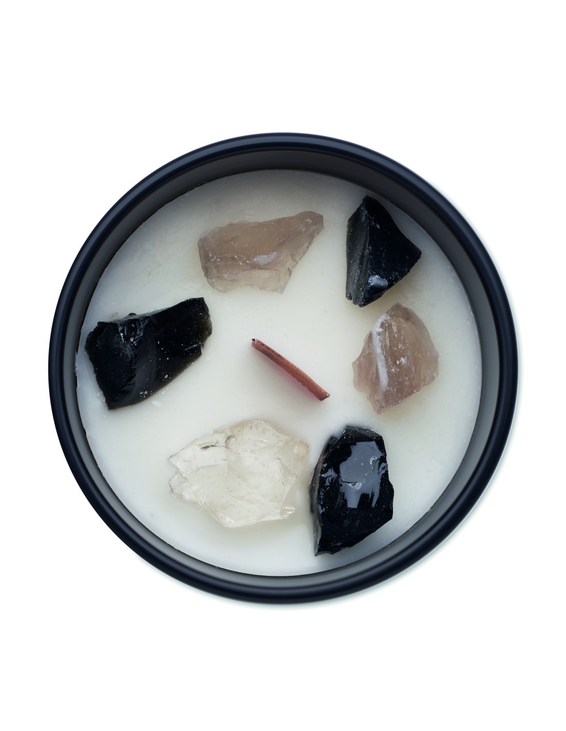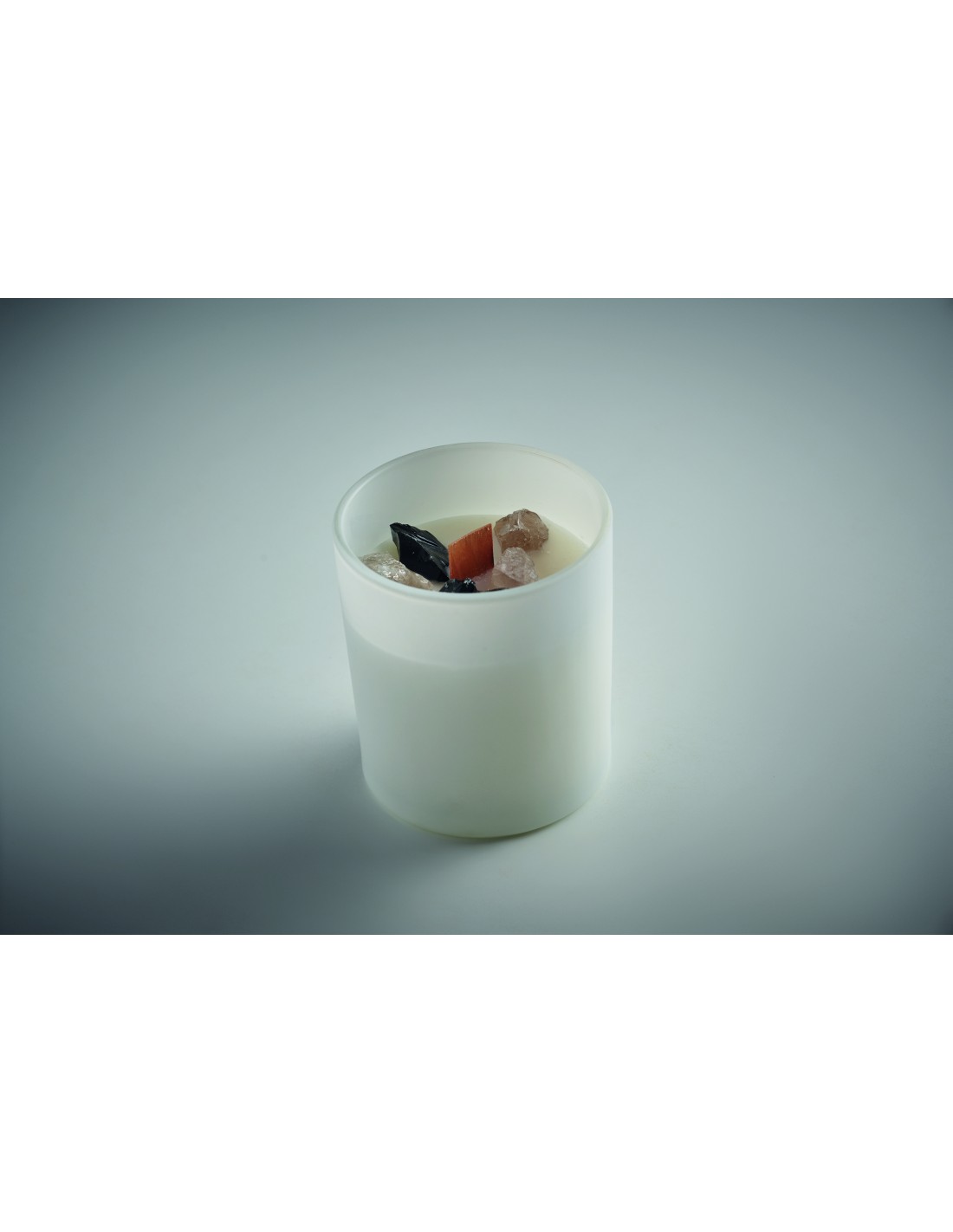 Vela de cera vegetal con fragancia de vainilla, en vidrio con piedras y mecha de madera. 200 gr. Tiempo de combustión: 20 horas.