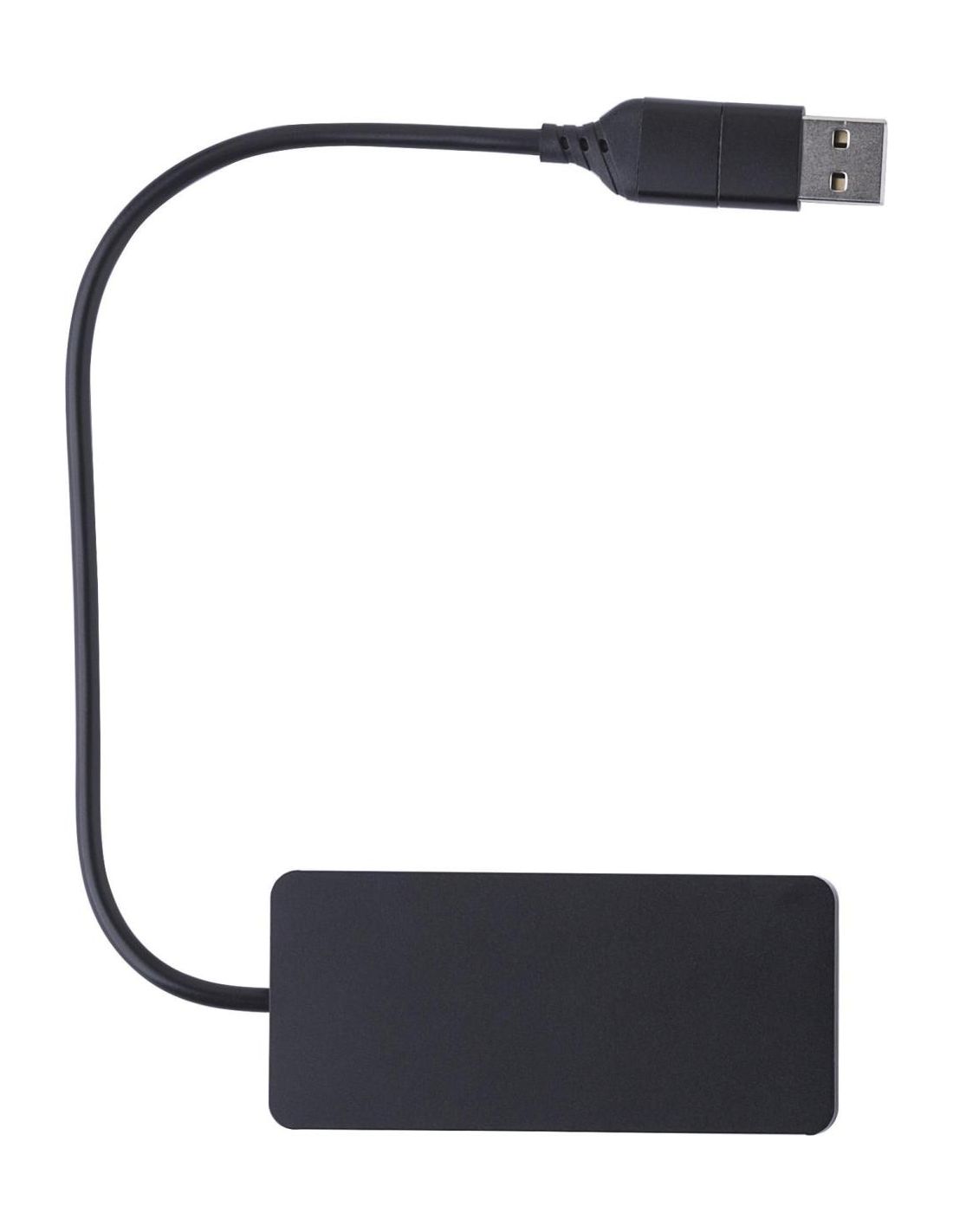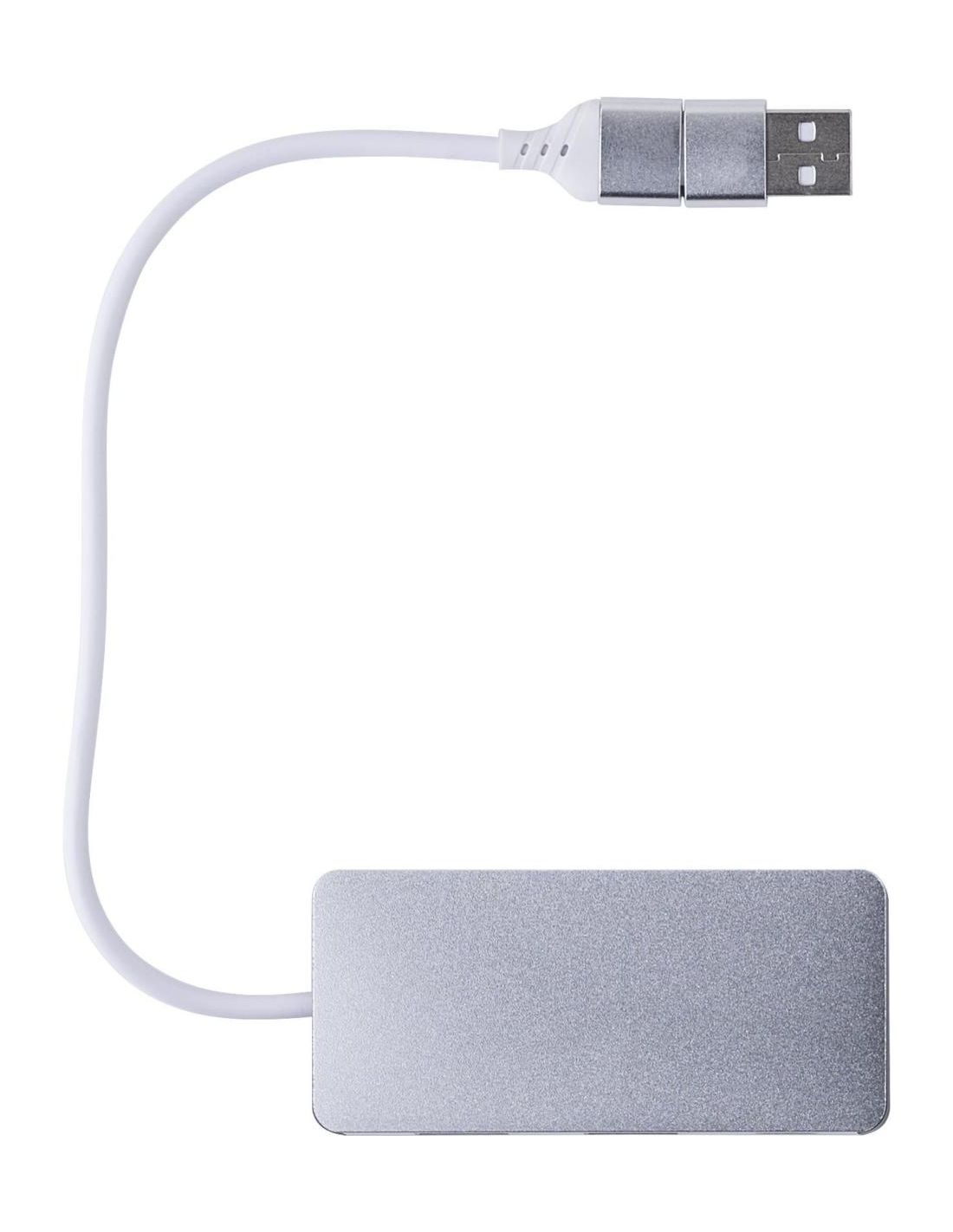 Hub USB de aluminio con 3 puertos. Dos puertos USB A, un puerto USB C. Logotipo 'reciclado' grabado en el producto.