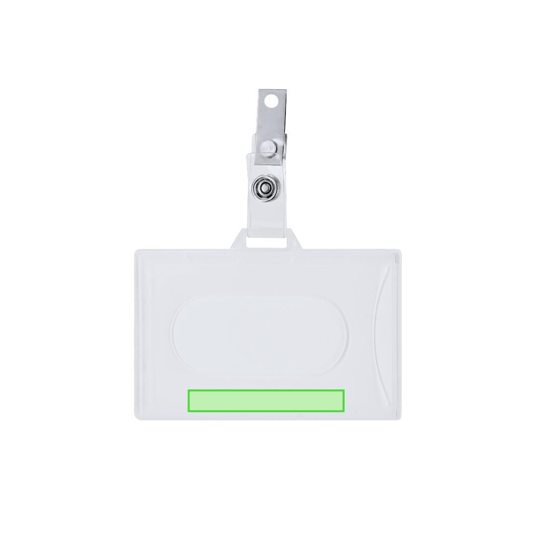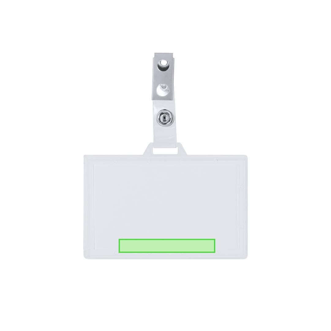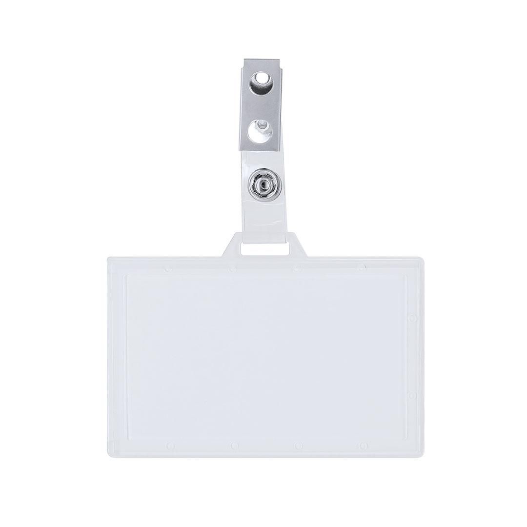 Identificador de PS rígido con pinza metálica en orientación horizontal. Ideal para llevar colgado y mostrar tu identificación. El sistema de cierre es extraíble y puedes utilizar el identificador en conjunto con lanyard.