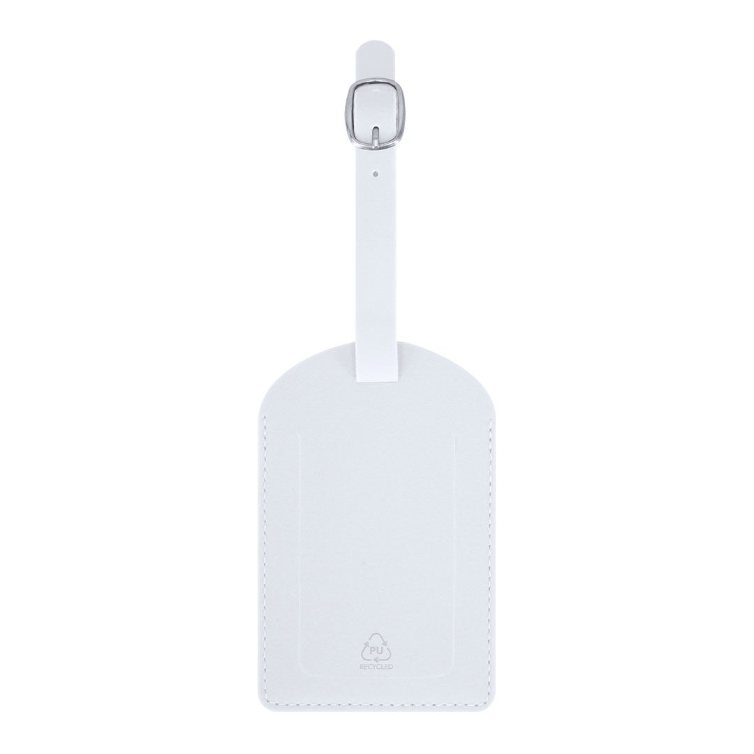 Identificador para maletas fabricado en PU Reciclado. Para enganchar a cualquier maleta gracias a su hebilla ajustable. Con ventana y etiqueta distintiva de PU Reciclado.