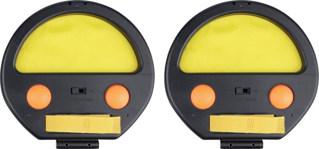 Juego de captura de pelotas, de ABS. Cuenta con dos soportes y dos pelotas por soporte. Tiene cierre en el mango para mantener los soportes cerrados y correas de velcro en cada lado para sujetarlo. Presentado en una caja de cartón marrón.