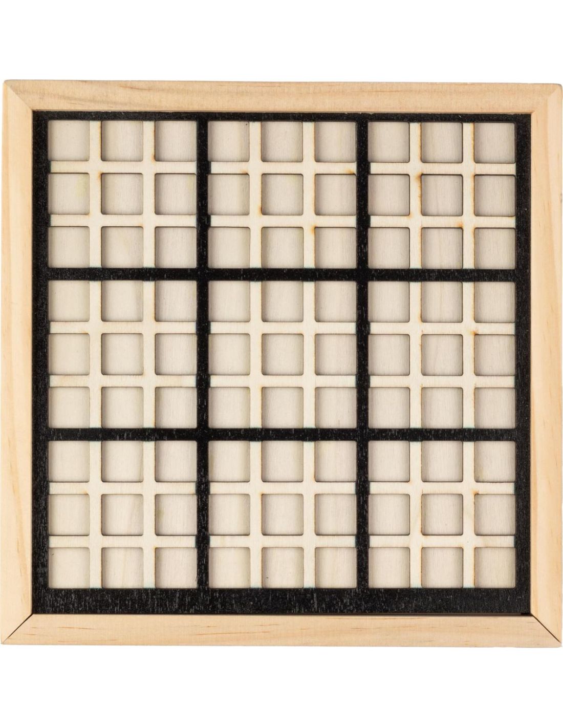 Juego de Sudoku de madera. Incluye 99 piezas de madera numeradas y un manual de instrucciones y soluciones de juego. Presentado en una caja de cartón marrón.