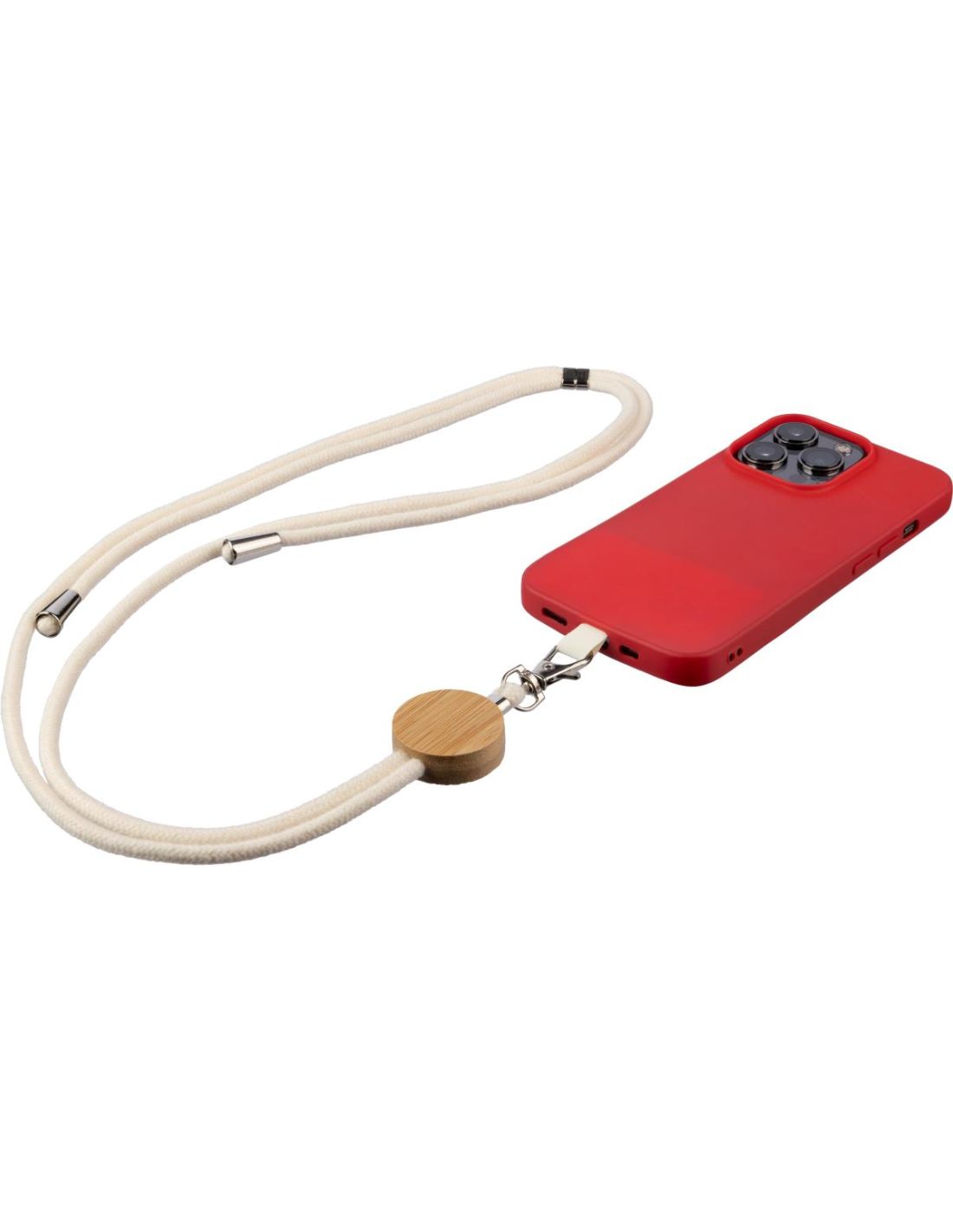 Lanyard de algodón con una placa redonda de bambú para imprimir. Incluye un mosquetón de metal para un teléfono móvil.