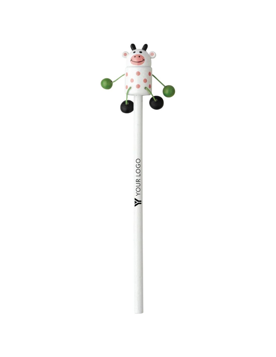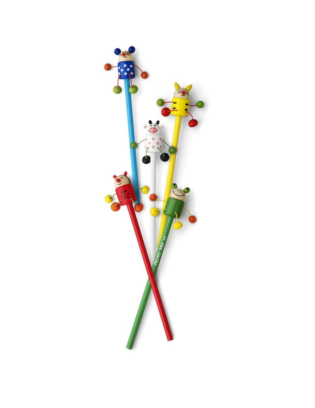 Lápiz de madera y sin punta con animalito en la parte superior, con brazos y piernas. 5 modelos diferentes: tigre, mariquita, ratón, sapo y vaca. Se entregan en cajas de 50 unidades con 10 lápices de cada modelo. Precio por unidad.