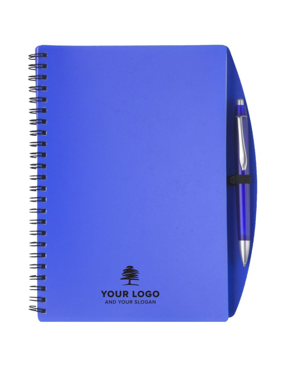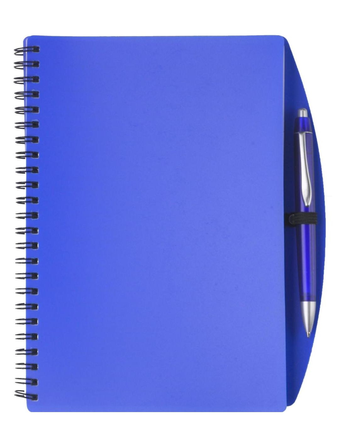 Libreta (aprox. A5) con tapas de polipropileno, 65 hojas y bolígrafo de plástico con clip de metal en color, a juego. Tinta azul.
