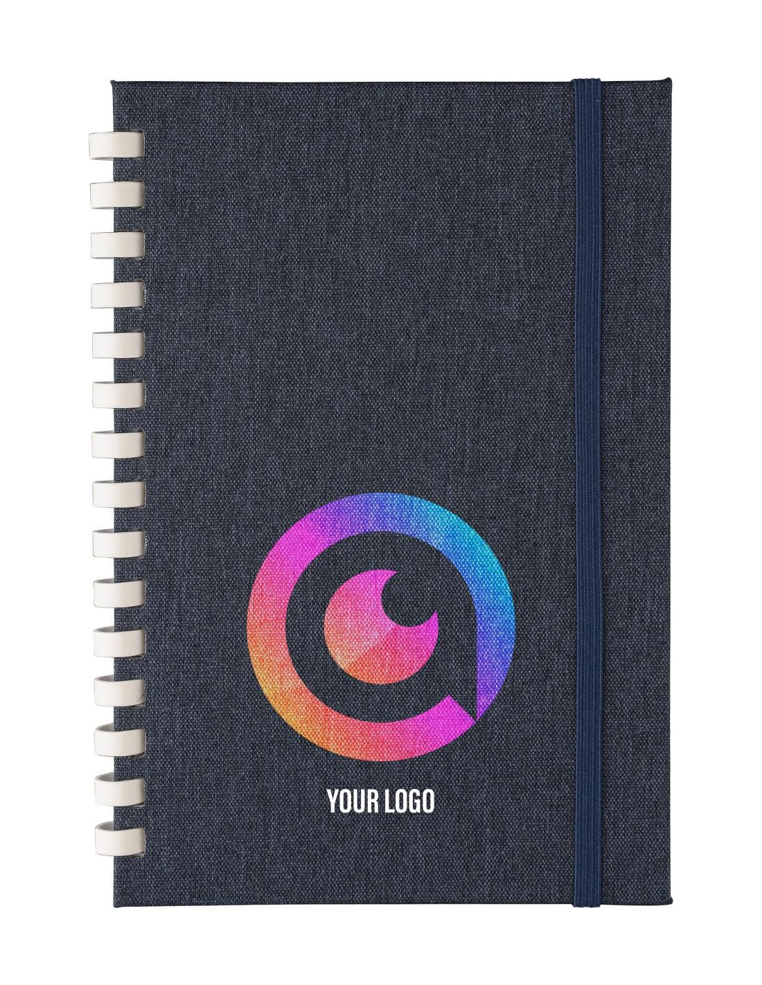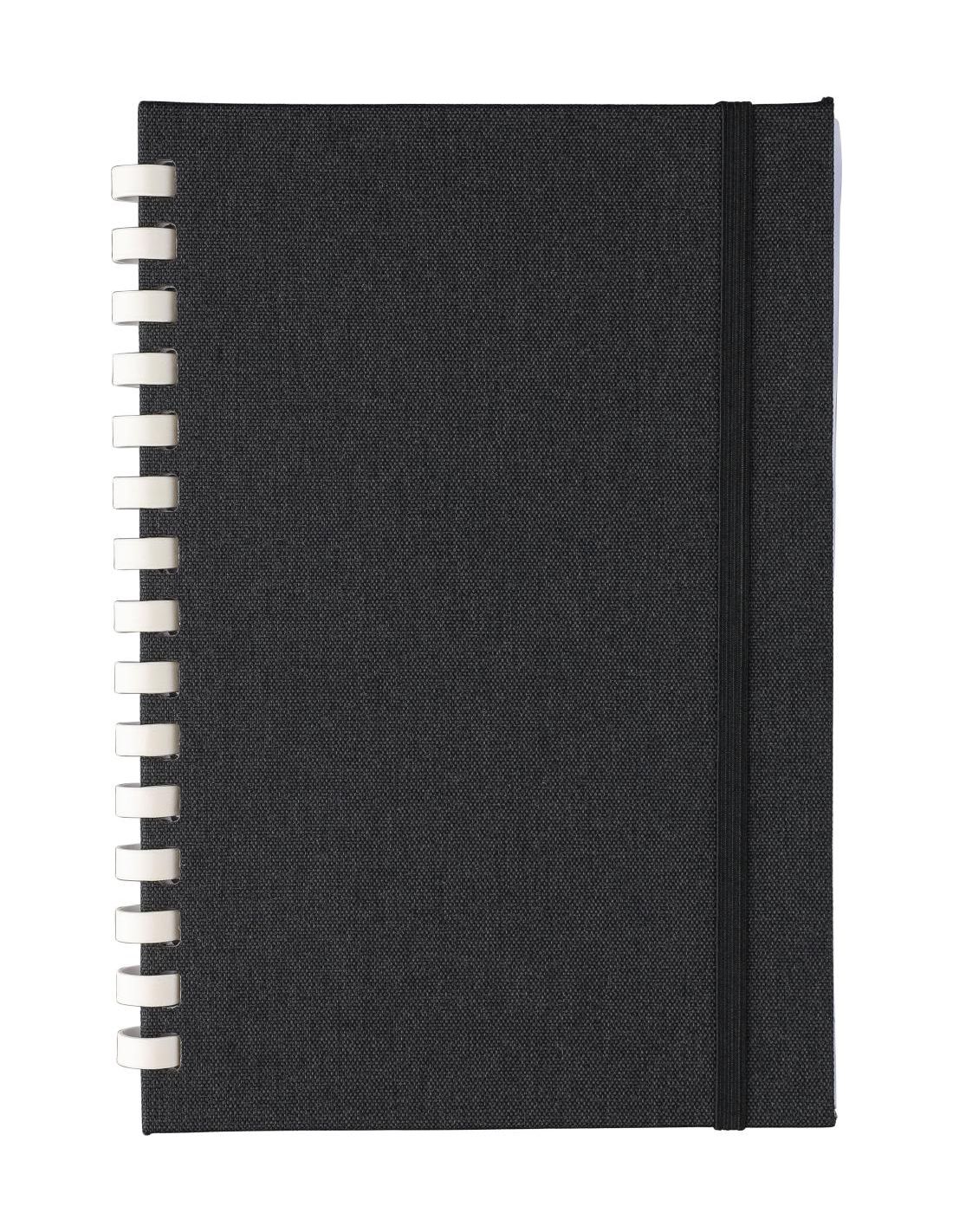 Libreta de rPET (aprox. A5) con tapa dura y cierre de cinta elástica. Presenta una espiral de cartón blanco (15 anillas), una cinta marcapáginas y …