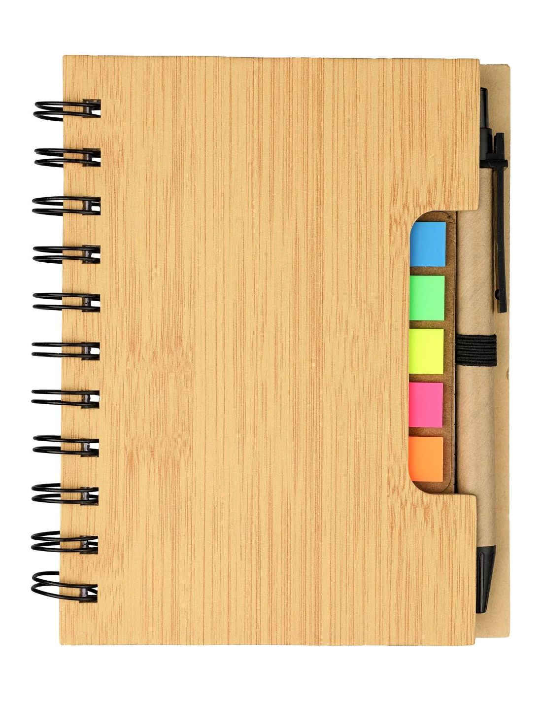 Libreta con espiral y aspecto de bambú. Tiene 70 páginas lineadas, varios colores de notas adhesivas y bolígrafo con tinta azul.
