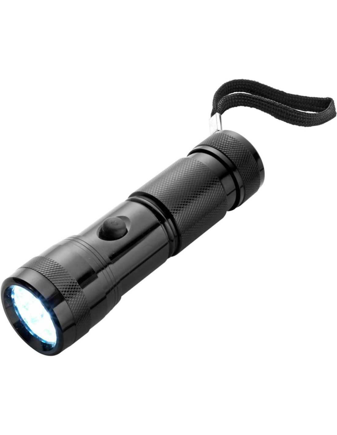 Linterna de aluminio y caucho con 14 luces LED blancas, interruptor de botón lateral. Presentada en un estuche de regalo. Pilas incluidas.
