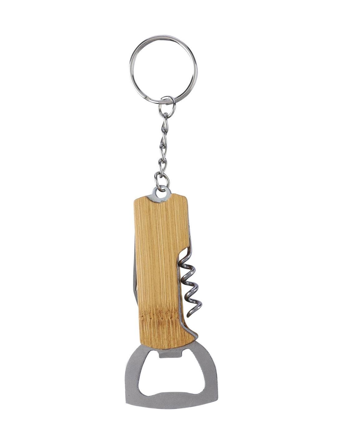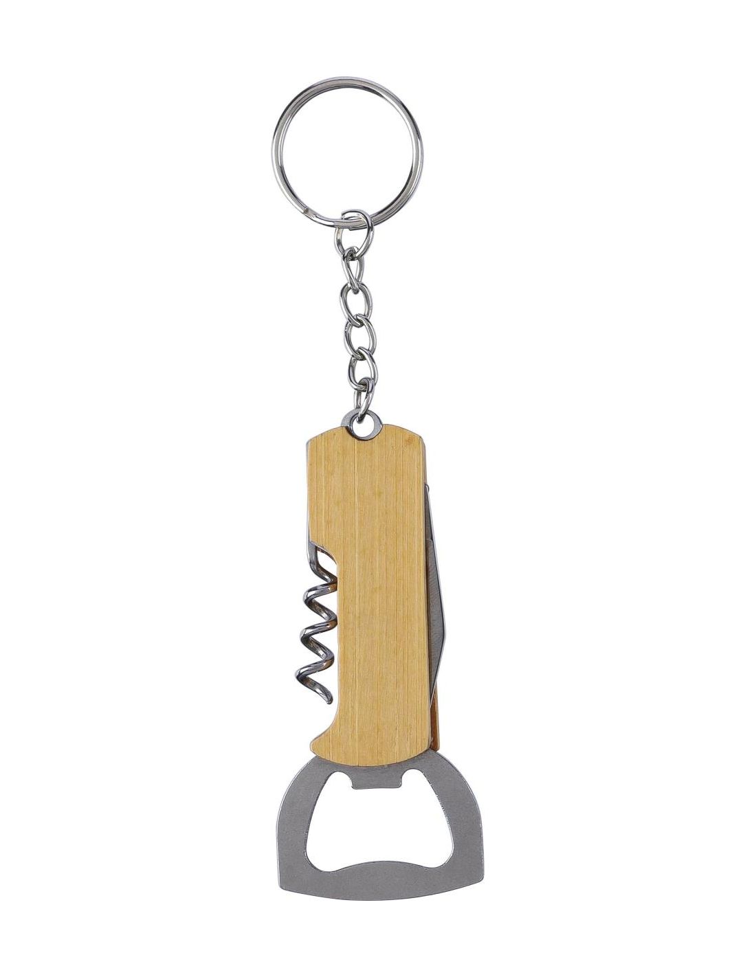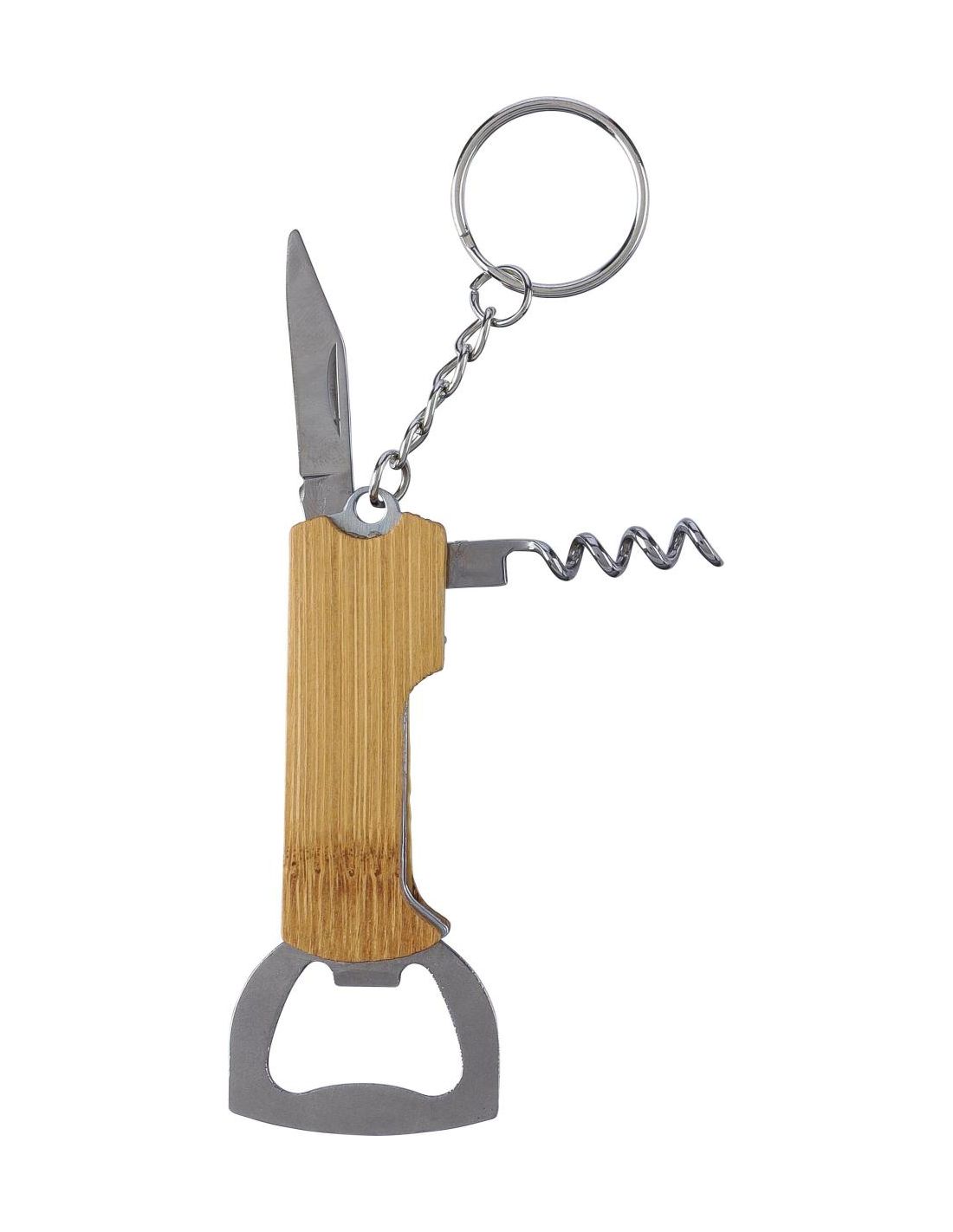 Multiherramienta de bambú con 3 funciones y un llavero de metal. Las funciones incluyen un abridor de botellas, navaja de bolsillo y sacacorchos. P…