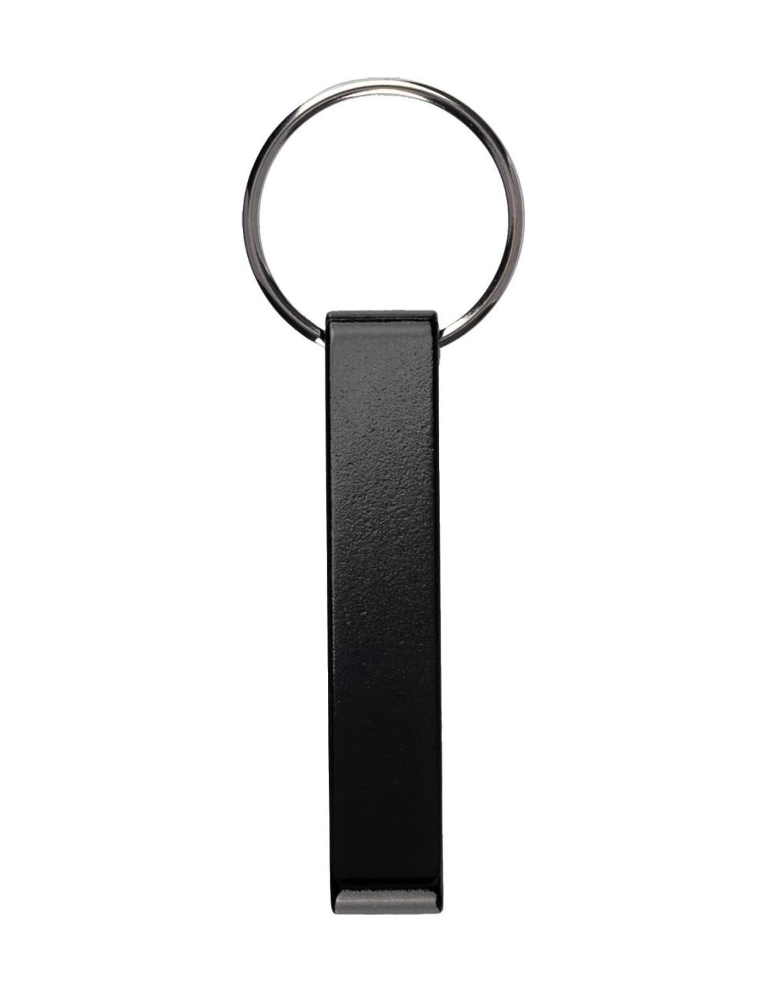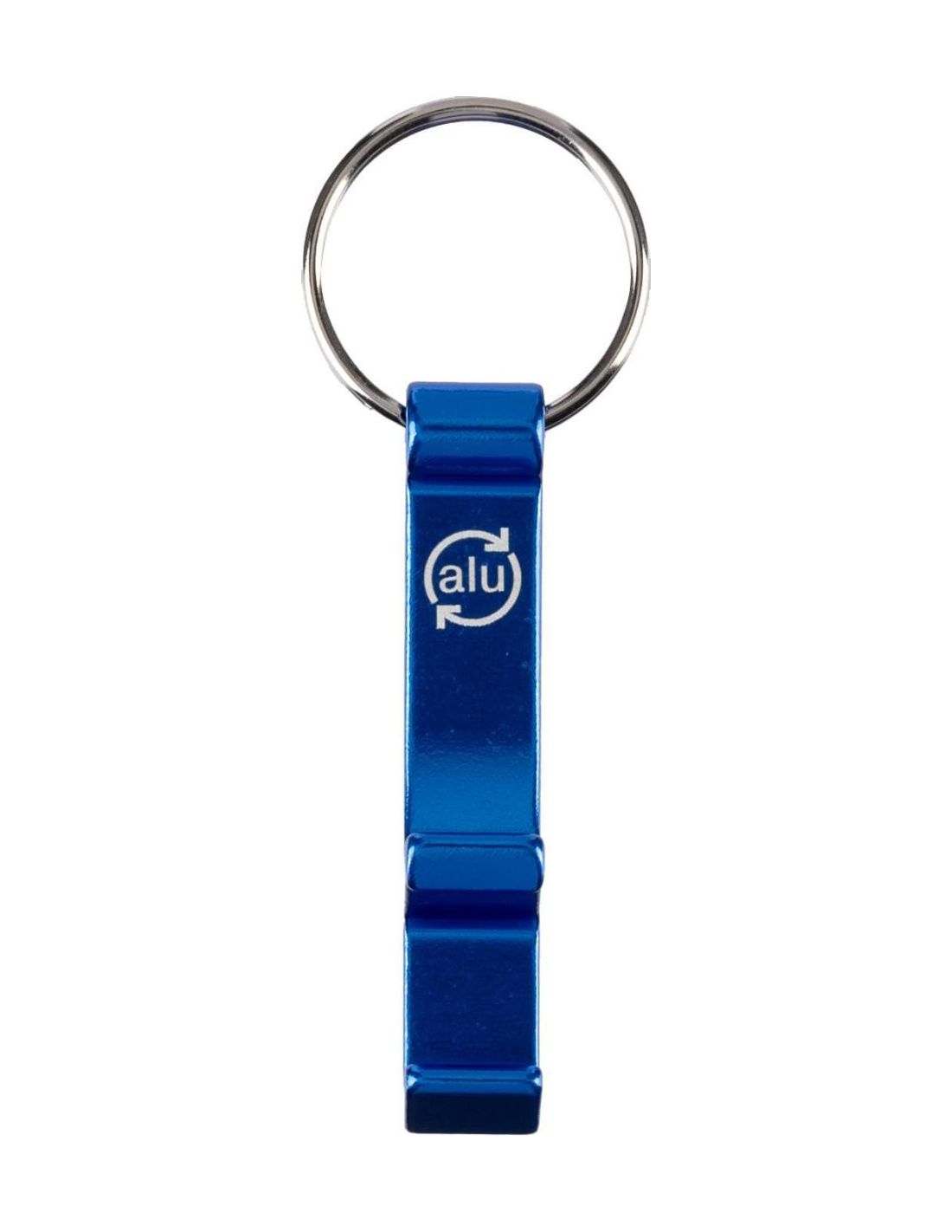 Llavero de aluminio reciclado con abridor y función de soporte para teléfono. Incluye el logotipo de aluminio reciclado grabado.