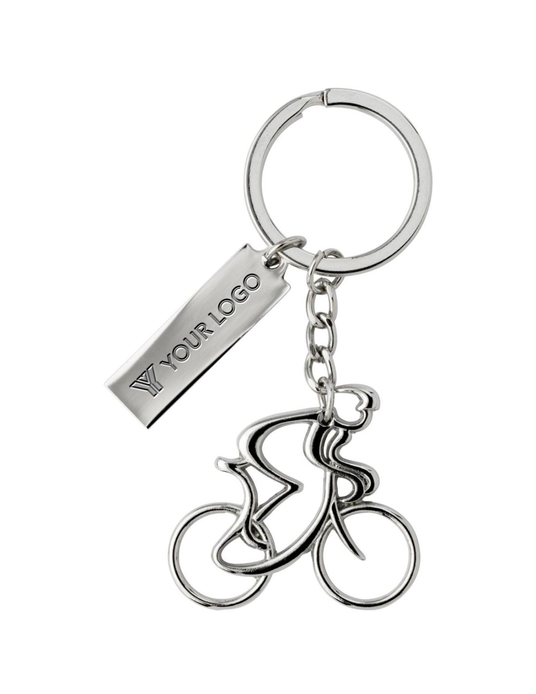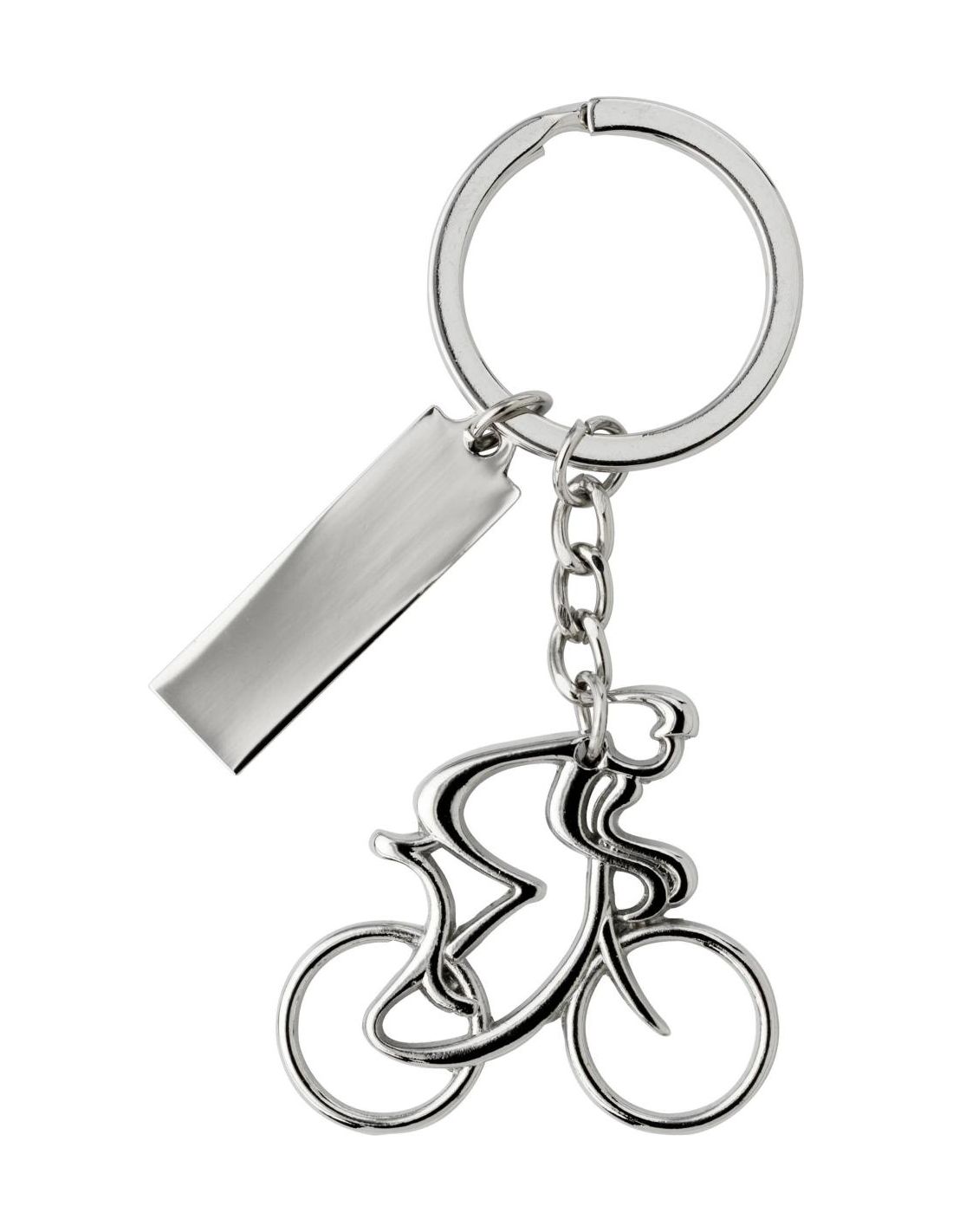 Llavero de níquel en forma de ciclista, con una placa rectangular para la personalización. Presentado en caja de regalo.