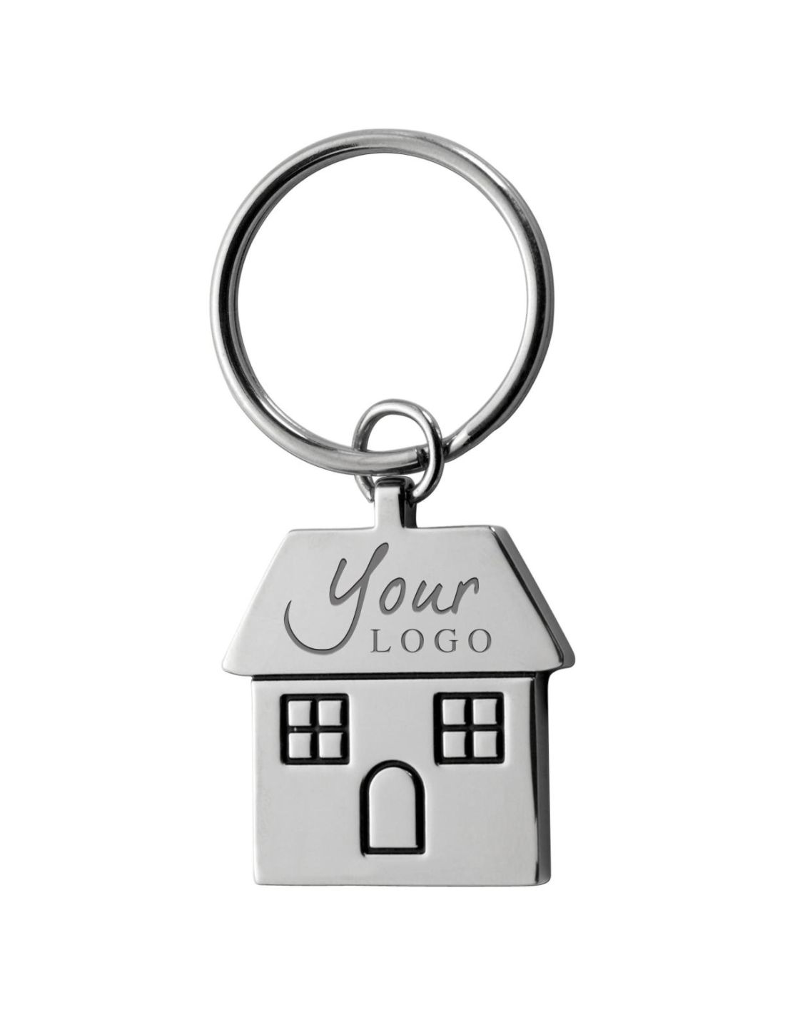 Llavero de metal en forma de casa. Presentado en una caja de regalo.