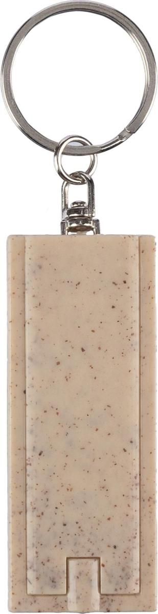 Llavero de paja de trigo con luz LED, anilla metálica y botón pulsador. Presentado en una bolsa de polietileno reciclada.