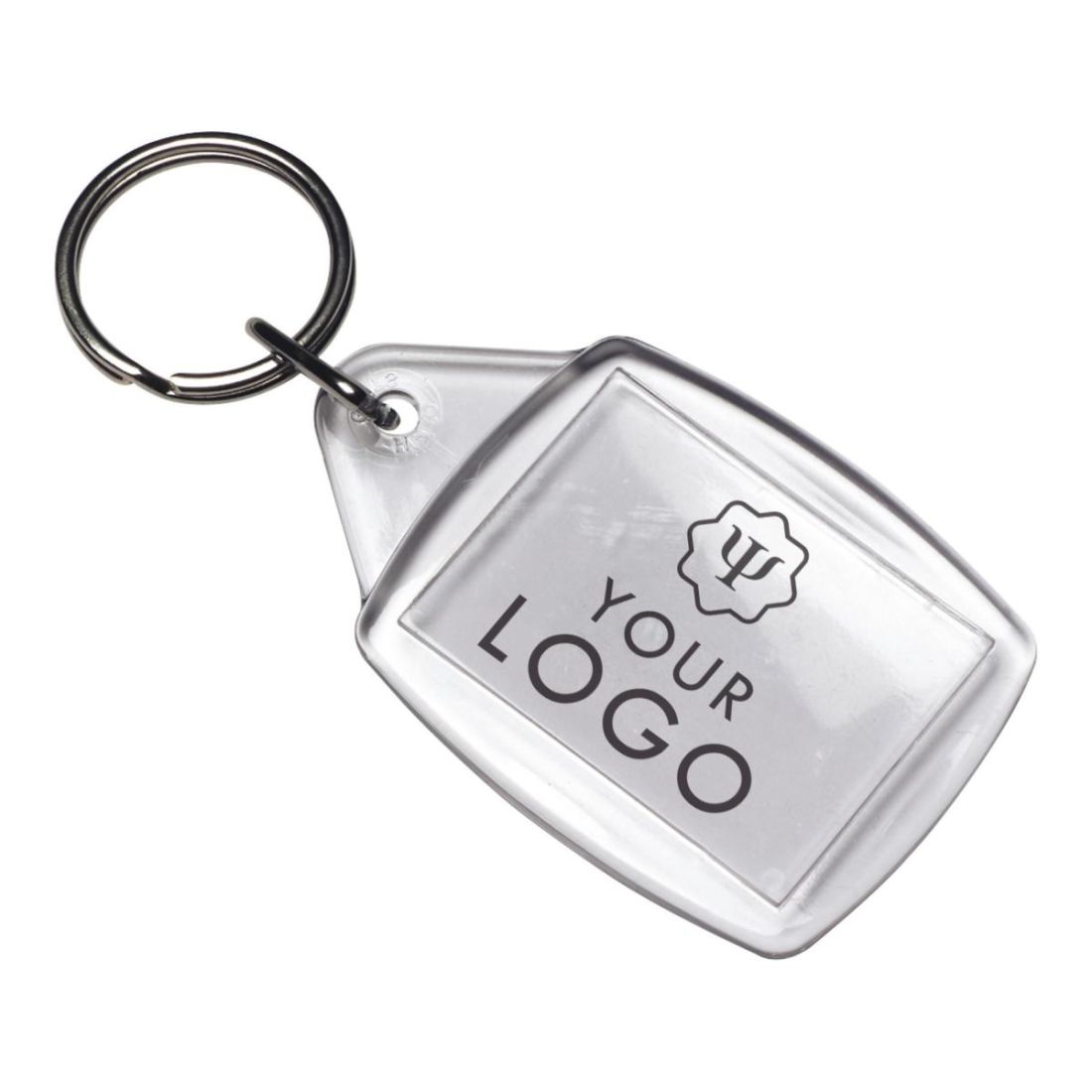 Llavero rectangular de plástico transparente. La impresión se realiza en un inserto de papel.