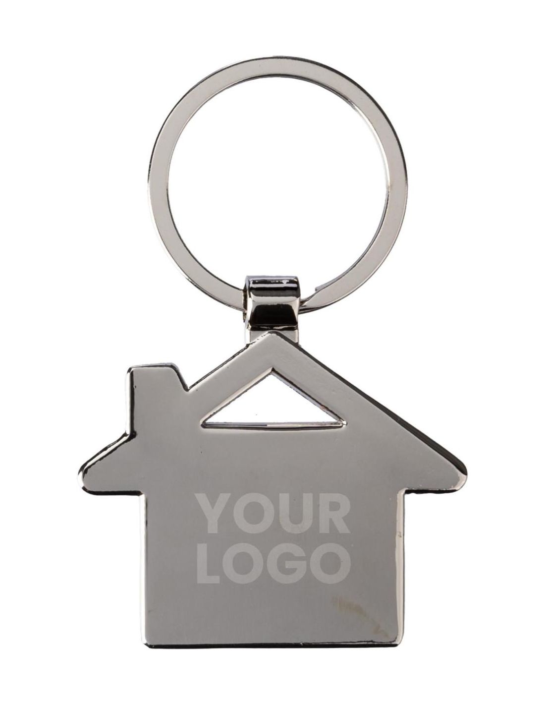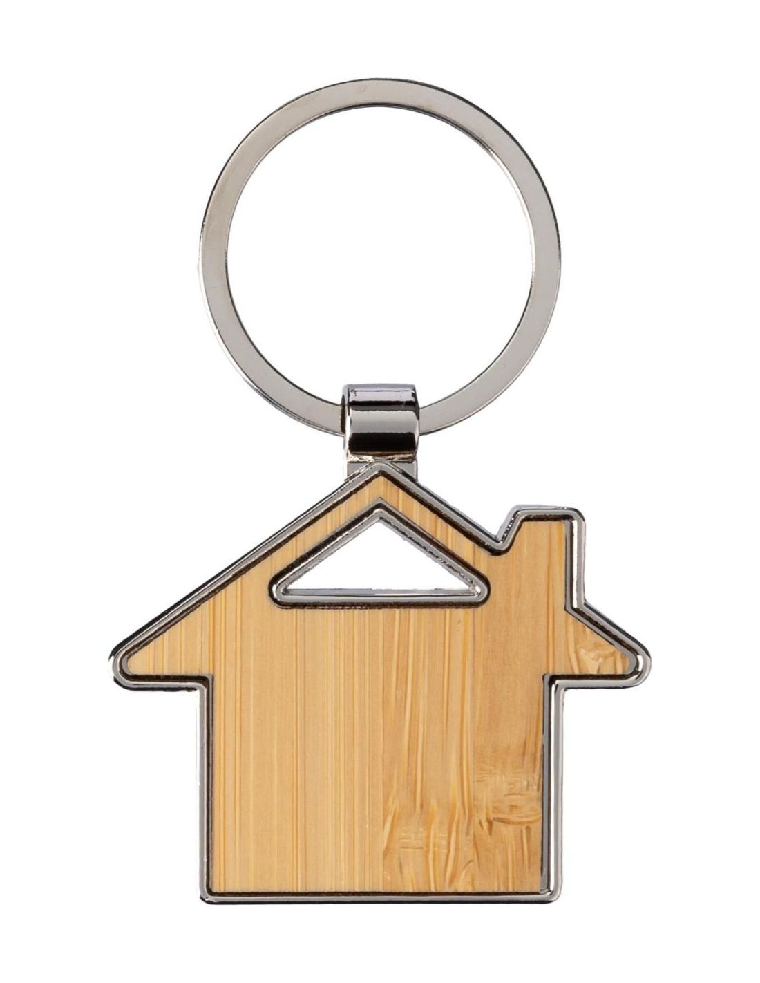 Llavero de aleación de zinc y bambú con forma de casa, y anilla metálica. Presentado en una funda Kraft.