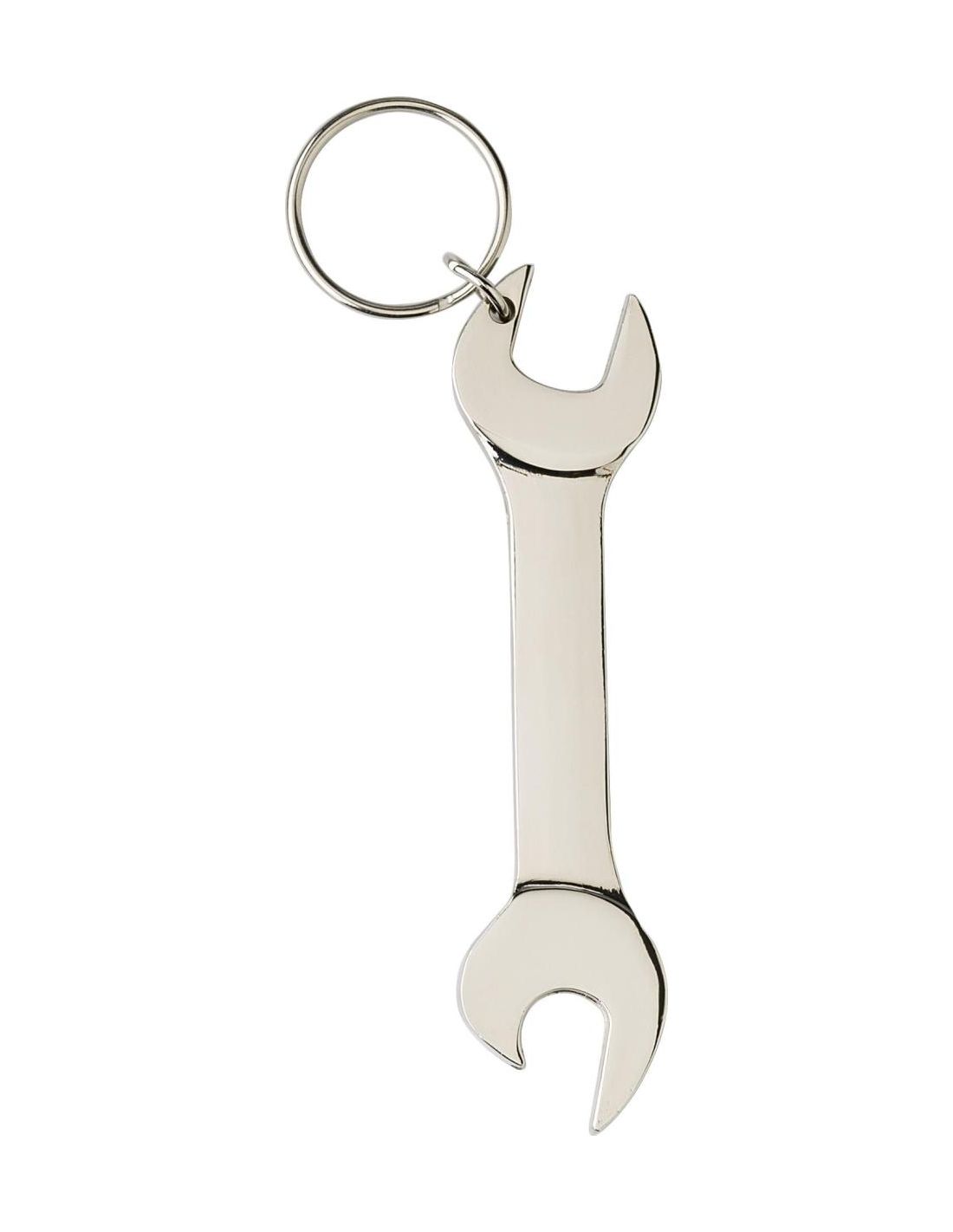 Llavero metálico con forma de llave inglesa y abrebotellas.