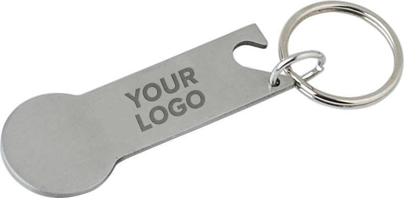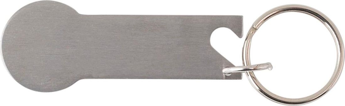 Llavero multifuncional de acero inoxidable con moneda para el carro de la compra y abrebotellas. Presentado en polybag.