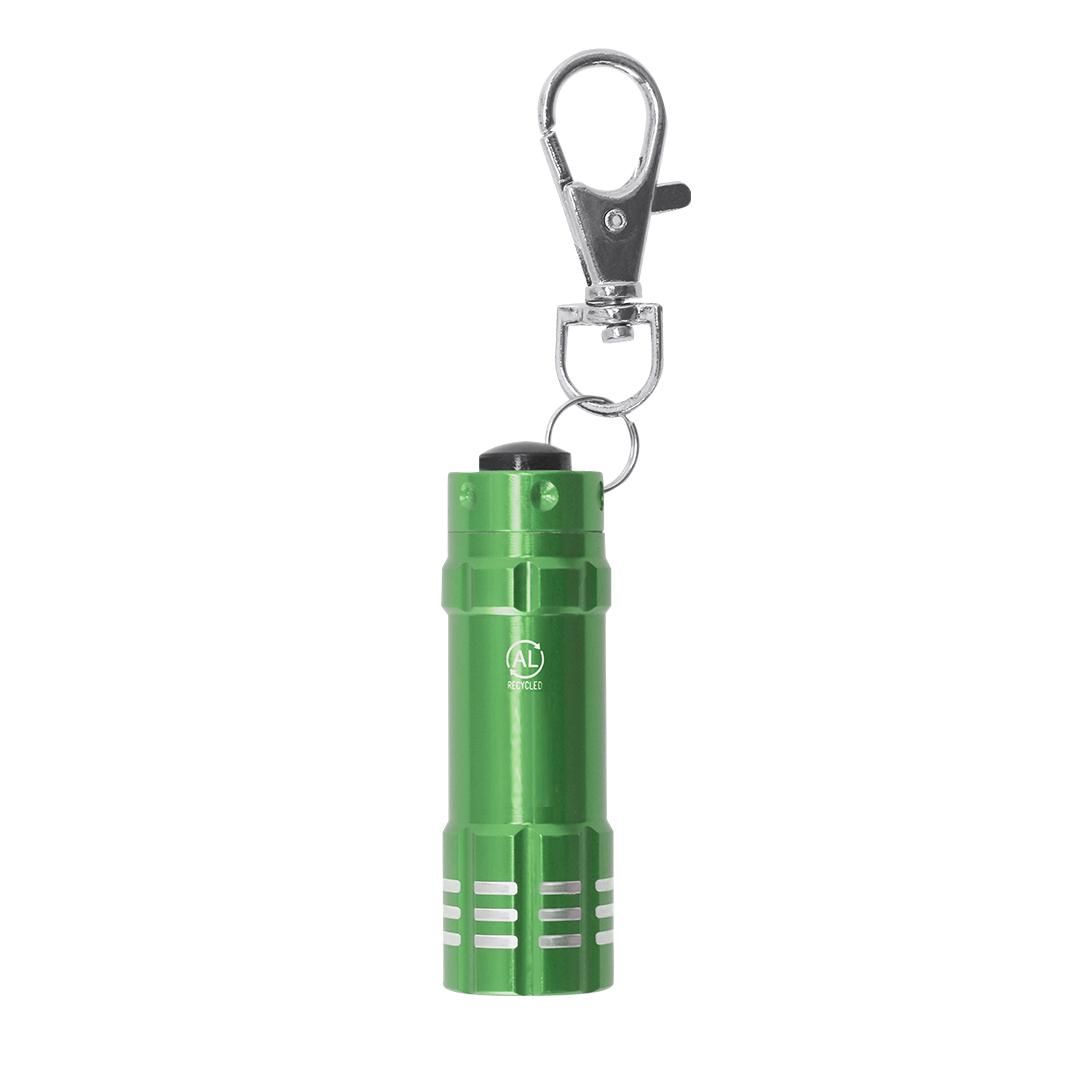 Resistente llavero linterna fabricado en Aluminio Reciclado con acabado brillante. Este práctico accesorio cuenta con 3 luces LEDs alimentadas por pilas de botón incluidas. Botón de encendido y apagado en la parte trasera en silicona. Su diseño incluye un mosquetón, ofreciendo un fácil transporte. Incluye logotipo Aluminio Reciclado.