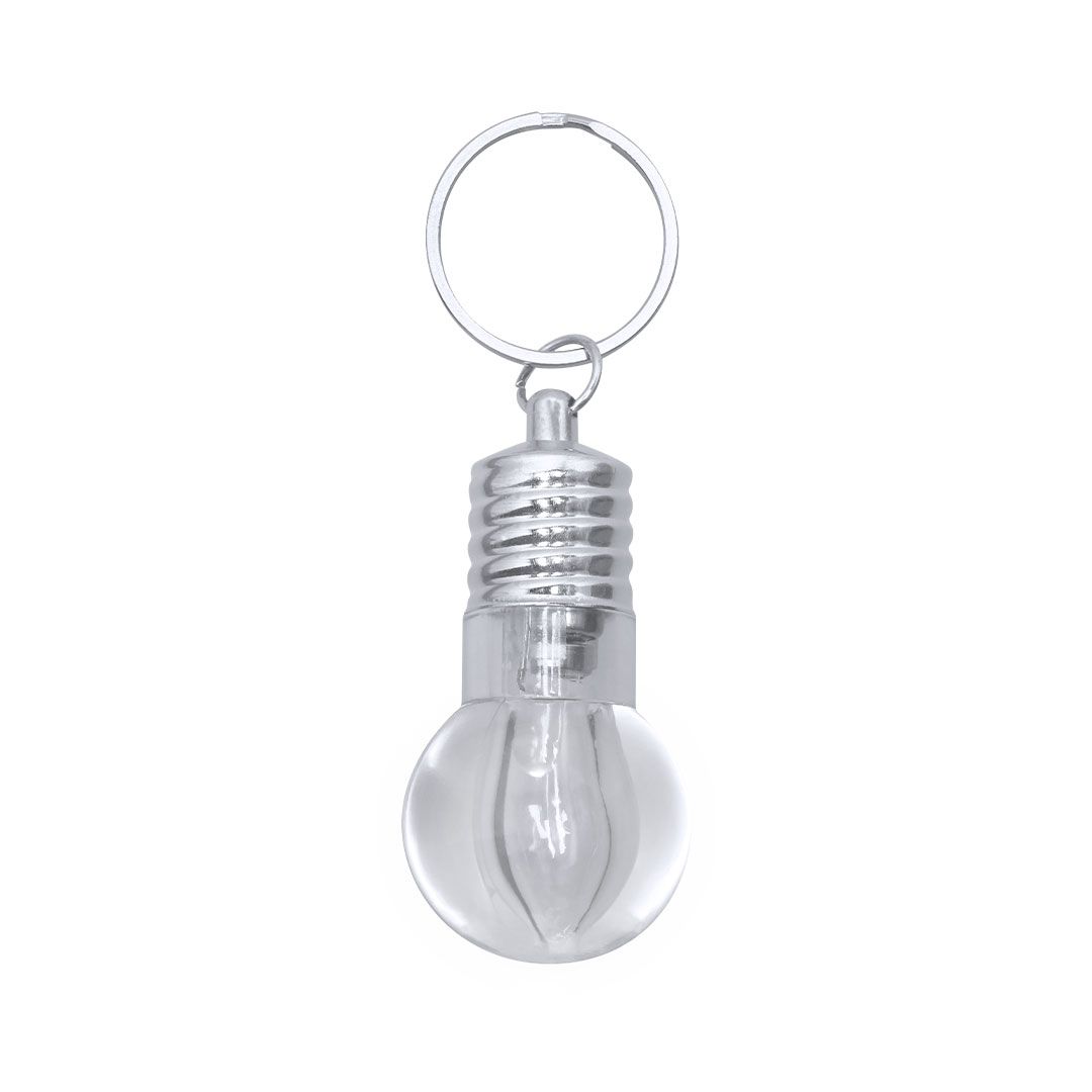 Llavero linterna con original diseño en forma de bombilla. Con 1 LED alimentado con pilas de botón (incluidas) con botón on/off en lateral y elementos decorativos y anilla cromados.