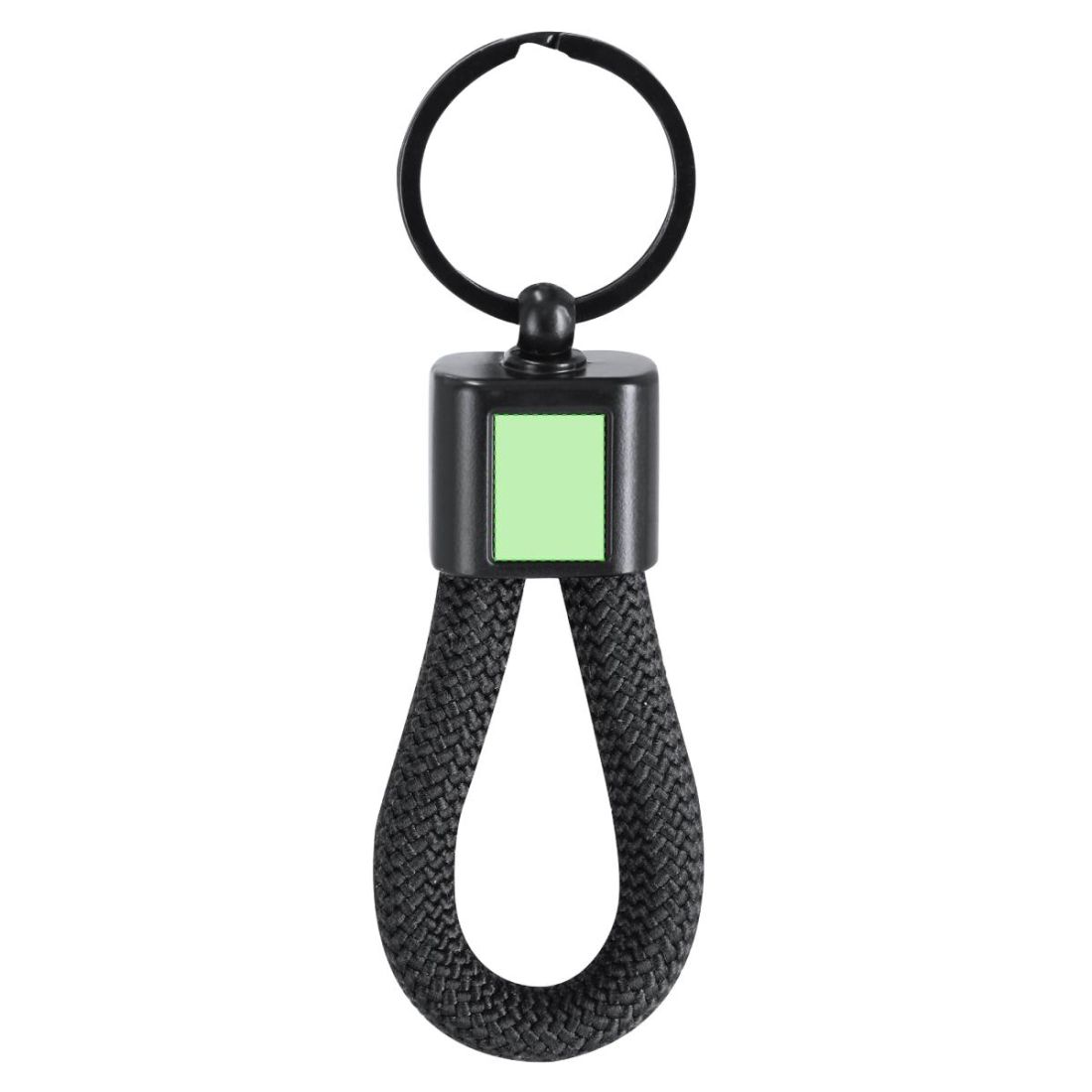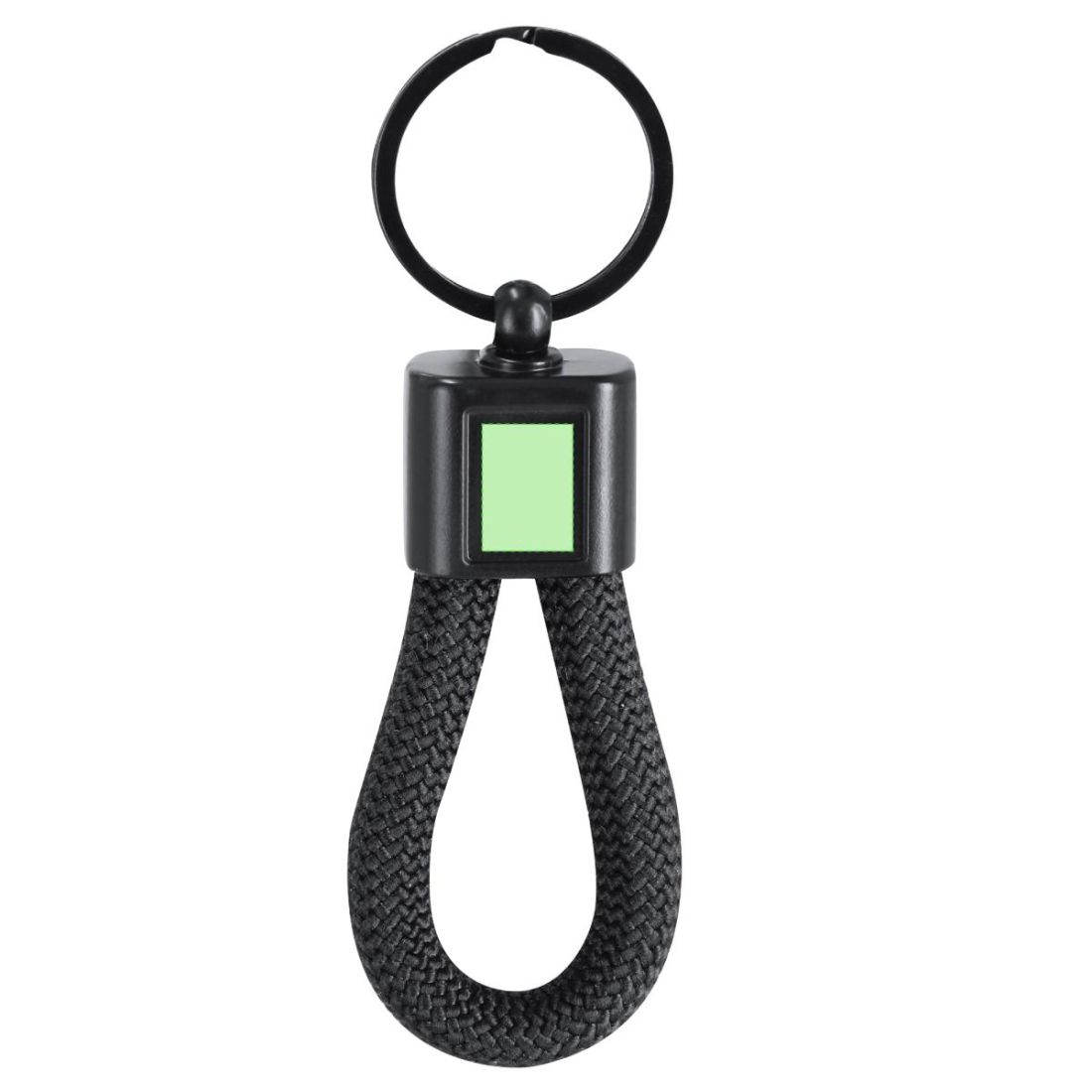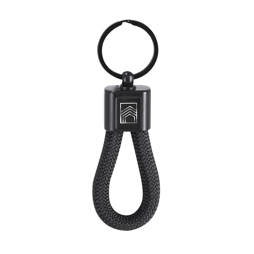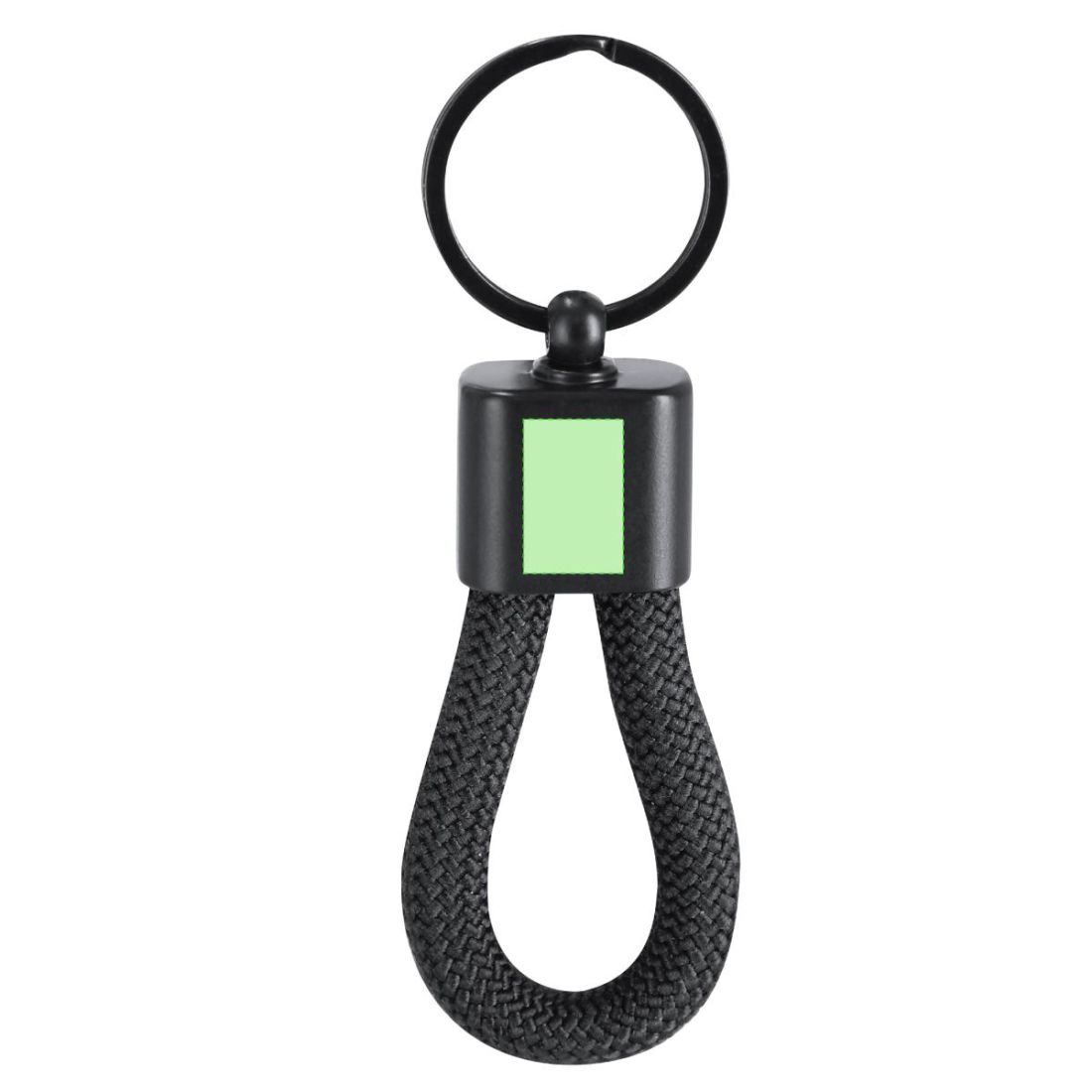Elegante llavero con cordón de polyester. Incluye pieza central metalizada, especialmente diseñada para marcaje en láser con efecto espejo.