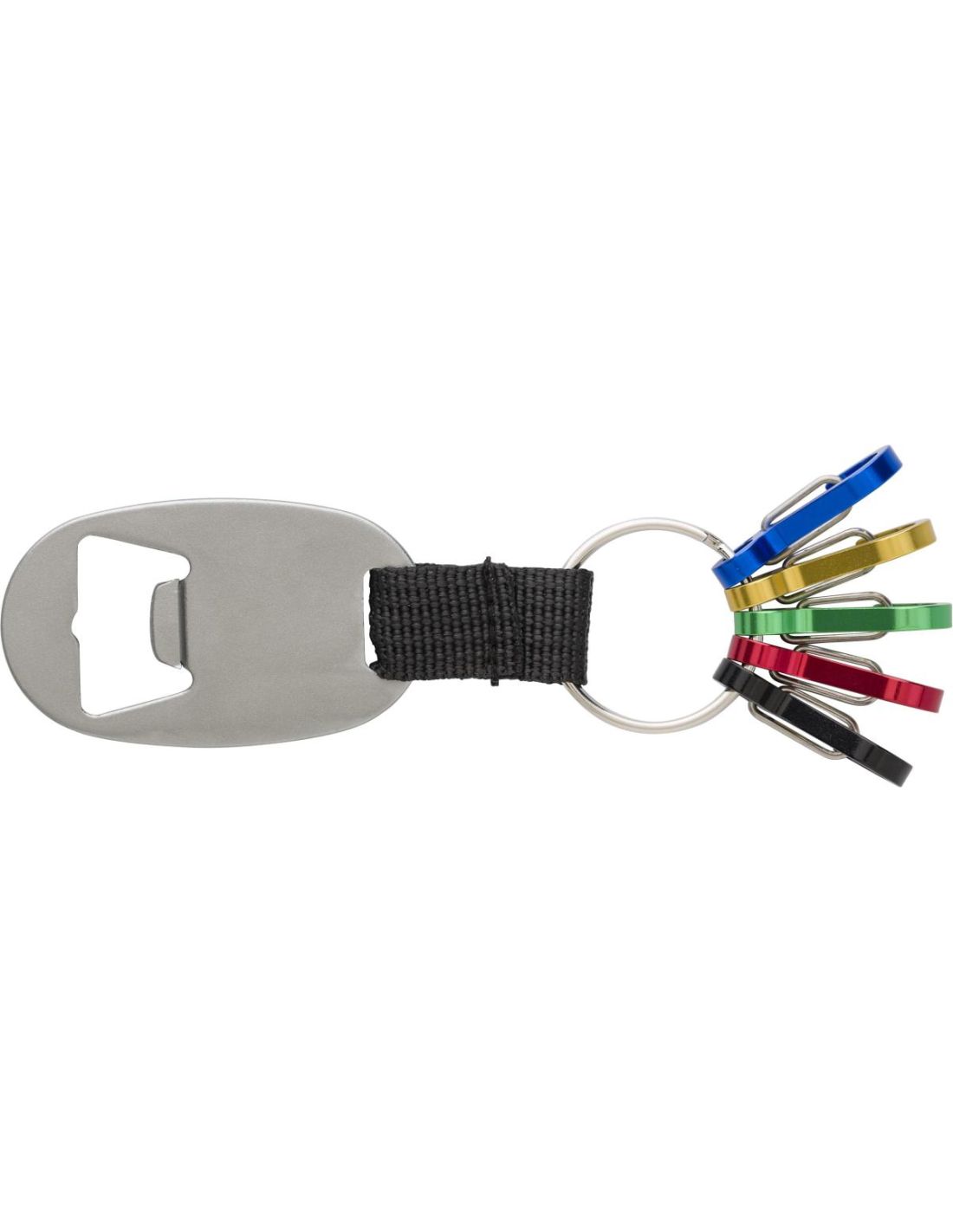 Llavero de aluminio con abridor y cinco mosquetones de colores.