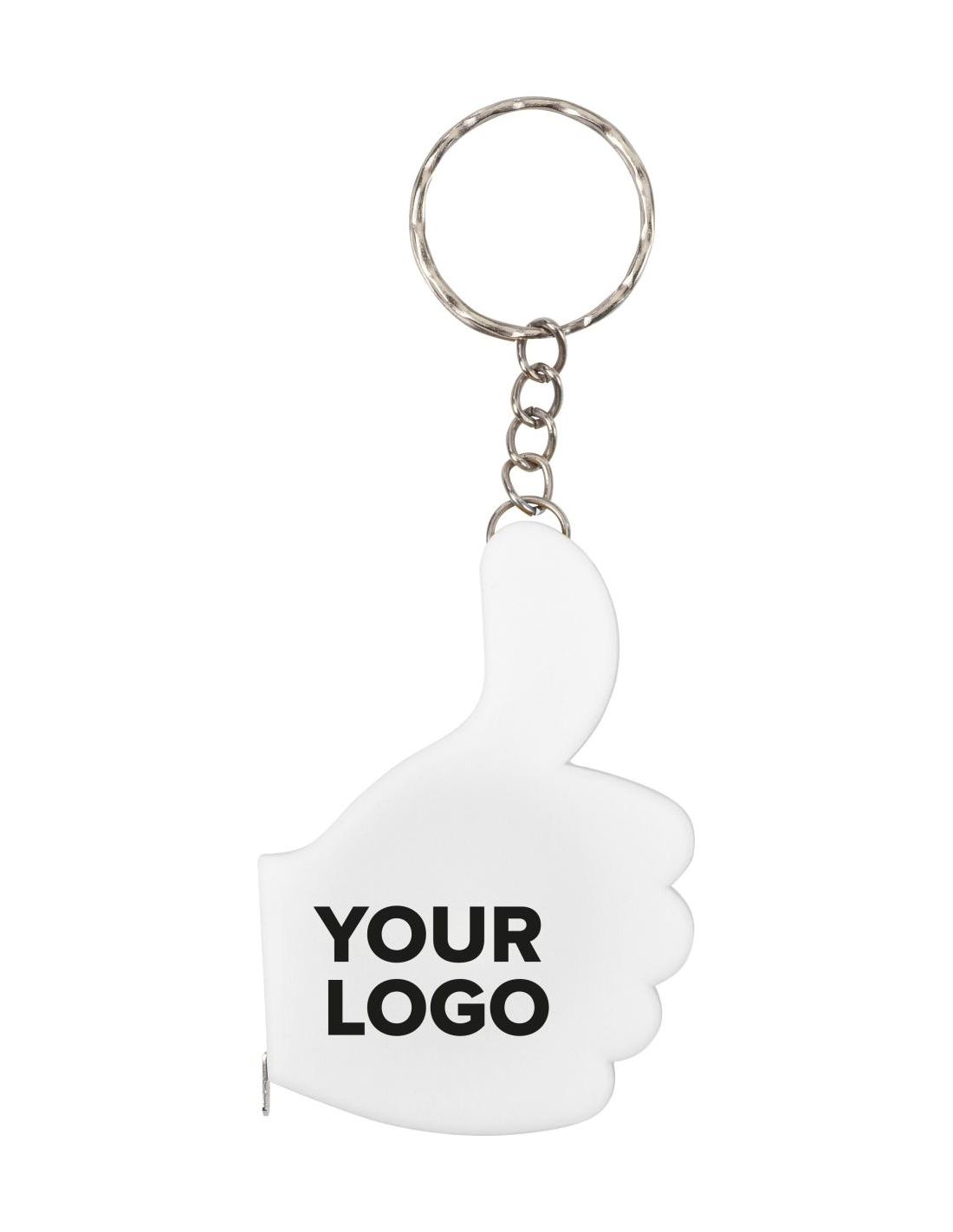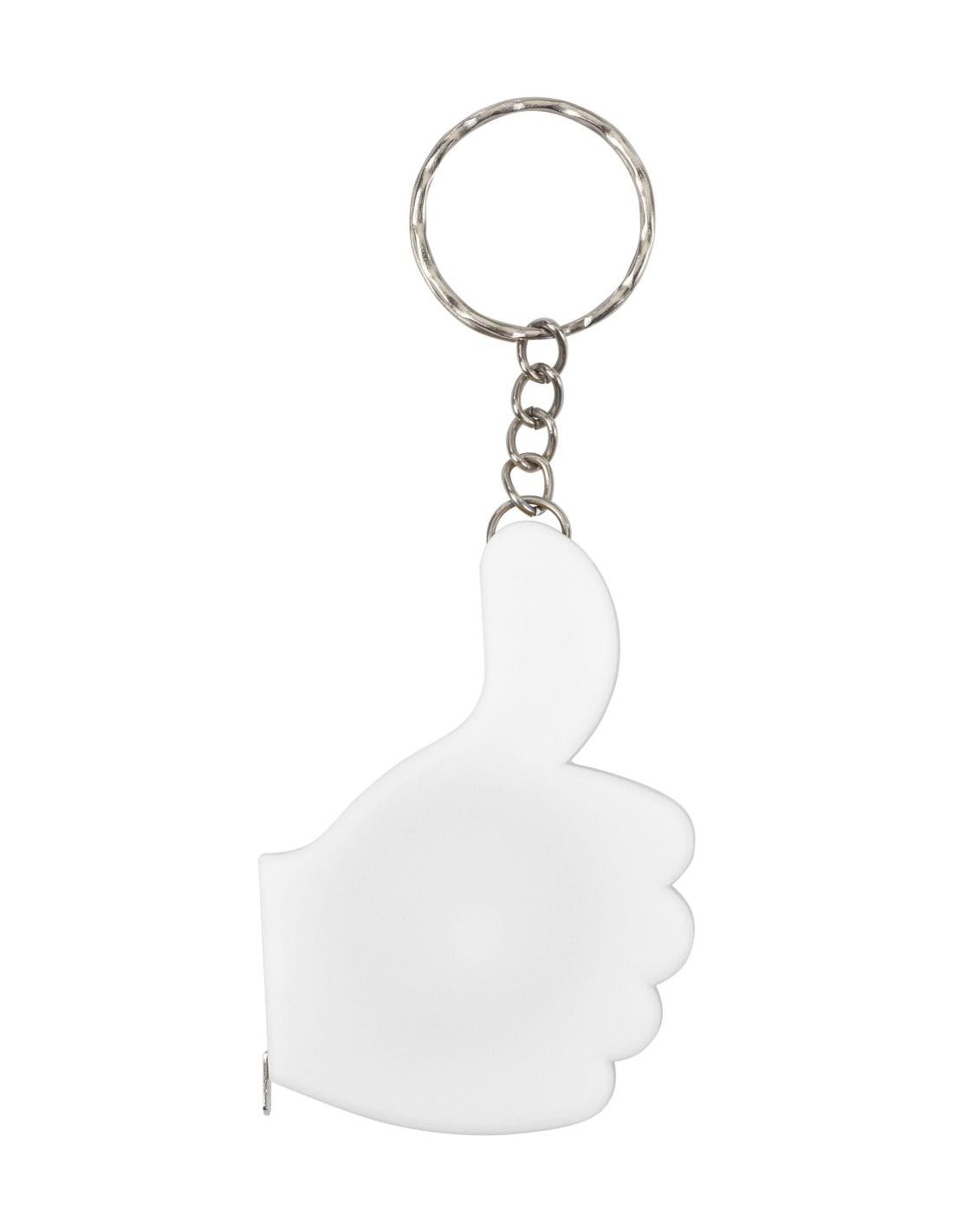 Llavero de PE con flexómetro de 1 metro y con forma de mano con pulgar hacia arriba. Doble graduación, milímetros y pulgadas.