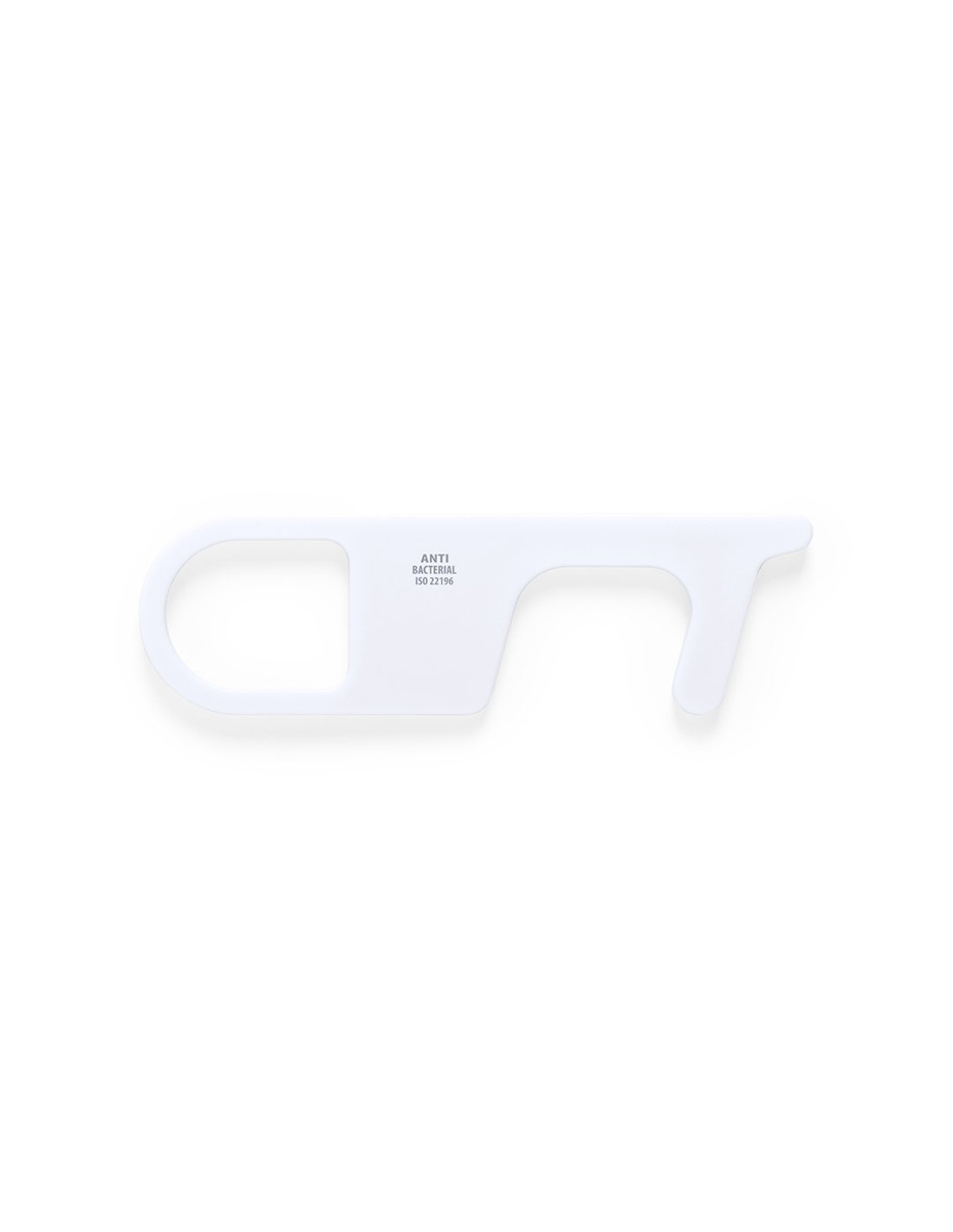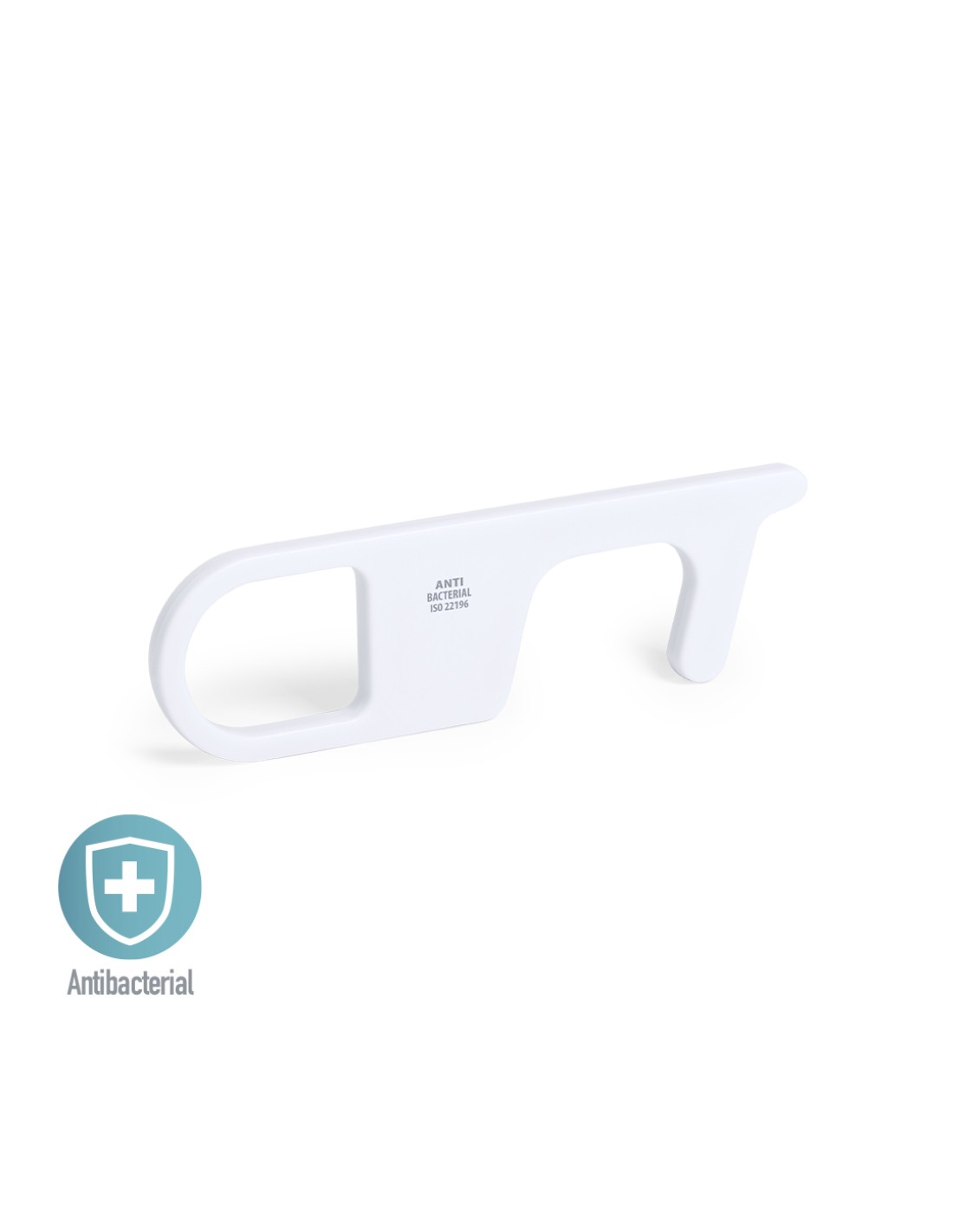 Llavero higiénico antibacteriano y anti-contacto, fabricado en resistente ABS de acabado sólido. Especialmente diseñado para evitar tocar con las manos superficies de uso común (picaportes de puertas, interruptores, grifos de uso público, cajeros automáticos...). Con cómodo troquel para el dedo y presentado en bolsita individual. Recomendado para marcaje en tampografía.Los productos con tratamientos antibacterianos son capaces de reducir drásticamente las cargas bacterianas presentes en las superficies de los materiales, gracias a la incorporación de agentes microbianos permanentes estáticos, con alta efectividad para inhibir y prevenir la contaminación bacteriana.Artículo de acuerdo al estándar ISO 22196, que determina la actividad antibacteriana en materiales plásticos y superficies no porosas, lo que permite conocer la efectividad de inhibición microbiana que tienen los aditivos sobre los objetos tratados mediante una evaluación cuantitativa.