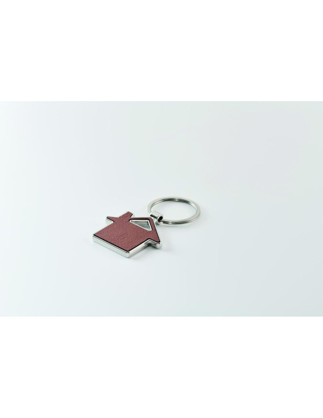 Llavero metálico en forma de casa con incrustación de cuero sintético reciclado.