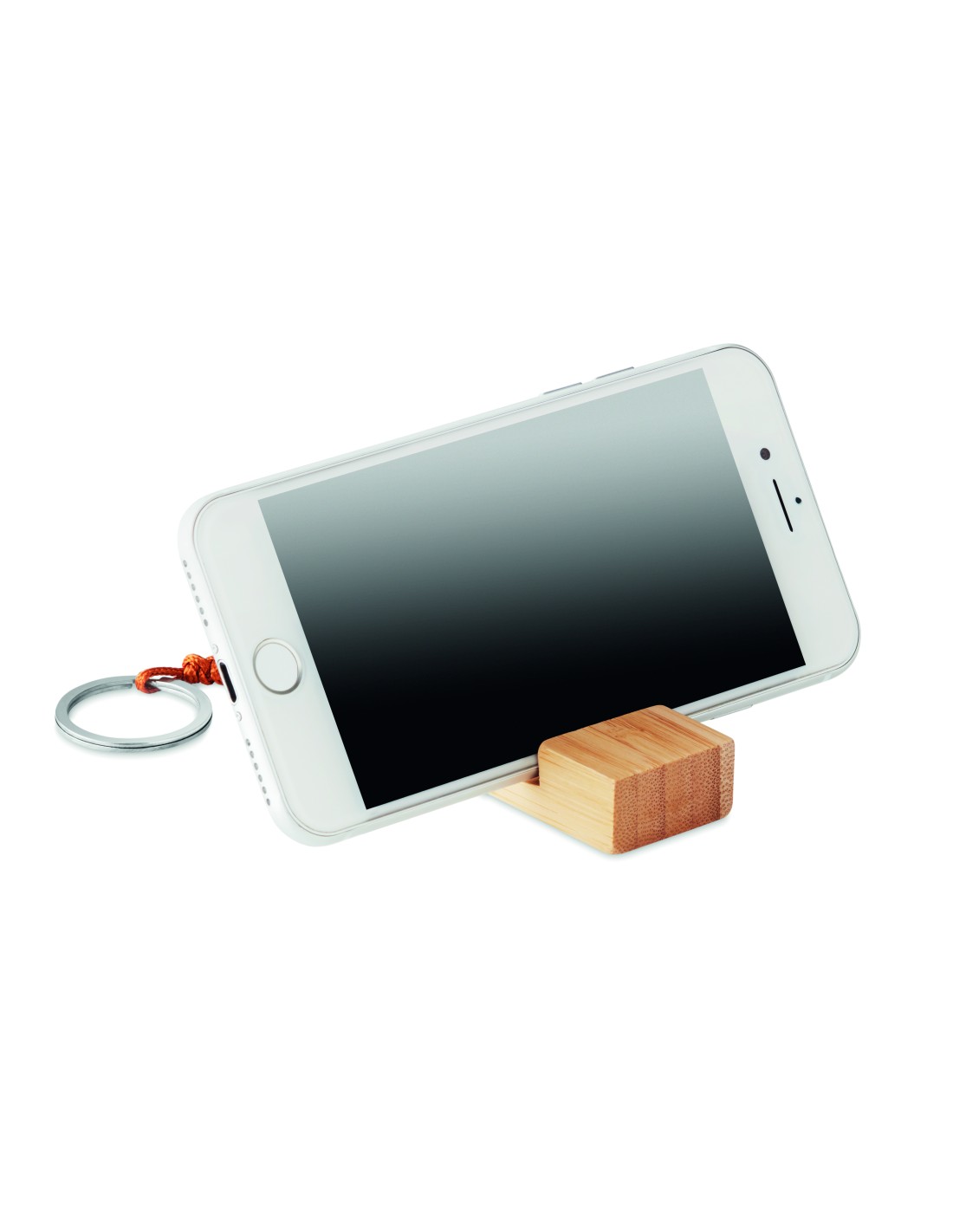 Llavero de bambú con soporte para teléfono. El bambú es un material natural, el color del articulo, la medida y la impresión sobre el puede variar.