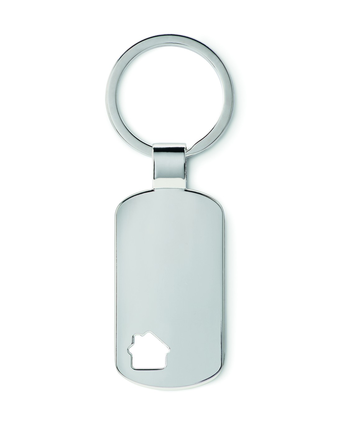 Llavero metálico con detalle de casa. Presentado en caja individual.